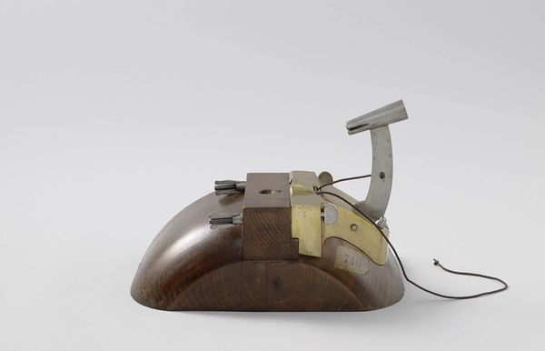 Editor: This is an anonymous wood sculpture from the early 19th century, titled "Model of a Ventilator." The geometric shapes are striking, but it's a bit… well, it's a rather utilitarian-looking artwork. What surprises or fascinates you about this peculiar sculpture? Curator: Utilitarian, perhaps! But also, in its quiet way, revolutionary. Imagine a world without readily available ventilation. This "model," likely crafted by an inventor, dreams of breathable air for the masses. It speaks to a very human desire: survival, cleverly masked by right angles and polished wood. Doesn’t the raising “arm” make you think of a salute? Editor: That's an interesting point; it is posed to offer air... Like a welcoming wave. So, you see hope and ingenuity in it rather than just the cold geometry of a machine? Curator: Exactly! It’s like a silent promise made in wood and brass. These inventors were trying to solve real-world problems, perhaps inspired by the foul conditions in mines, hospitals or even prisons. Also, that single lever is inviting us to take control. Doesn’t it trigger your imagination? How does this primitive shape address today's need for more environmentally conscious architecture? Editor: It’s remarkable how something so seemingly simple can spark so many thoughts. I was just judging the box by its shape. I never considered the driving force, its story, of improving life through ingenuity! Curator: Right? Art isn’t always pretty pictures; sometimes it’s the beautifully formed question marks of the past. And what a necessary function –ventilation - , especially poignant now as we still struggle to make healthy indoor spaces accessible for everyone!