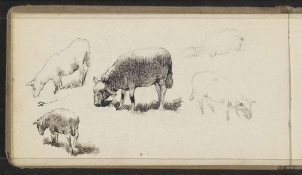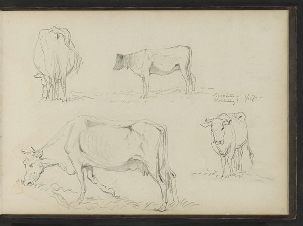 Curator: Looking at this drawing, titled "Studieblad met koeien en een boom," created sometime between 1834 and 1903 by Johan Hendrik Weissenbruch, it's a simple yet charming depiction of cows and a tree, rendered in pencil on paper. It is currently housed in the Rijksmuseum. Editor: There's something so restful about it. A casual scene, captured swiftly with such loose, expressive lines. You immediately get a sense of the stillness, the pastoral quiet, even though it's just pencil on paper. Curator: Weissenbruch was known for his landscapes, focusing on capturing the Dutch countryside, its light and atmosphere. This sketch reveals an important aspect of his process: the direct observation and material engagement required for creating more polished pieces. Editor: Indeed. Note how the drawing shows signs of the artist studying his subjects. The varying weights of the pencil strokes demonstrate Weissenbruch carefully observing the shapes and forms, the physicality of the cows. It showcases art-making as labor and visual investigation. Curator: Exactly. One can also see that his work served a specific function. Agricultural themes such as grazing cattle were popularized in the mid-19th century. There's the increasing industrialization of Dutch society during that time and also a renewed interest in representing "authentic" rural life. So Weissenbruch isn’t just recording what he sees; he’s responding to wider societal values. Editor: You are so right. It goes beyond the surface level—it is as though the consumption of rural imagery had the power to soothe anxieties triggered by societal change. I'd also venture to say that Weissenbruch's compositions speak of the art market—he created them to appeal to an audience craving tranquility amid a transforming landscape. Curator: It’s that interplay of observing material realities with art and the social conditions surrounding artistic production, which provides a rich, holistic experience here. Editor: For me, this glimpse into his working process, and considering the impact his art held, transforms the piece into much more than what meets the eye. Curator: Indeed, thank you, those comments are very enlightening.