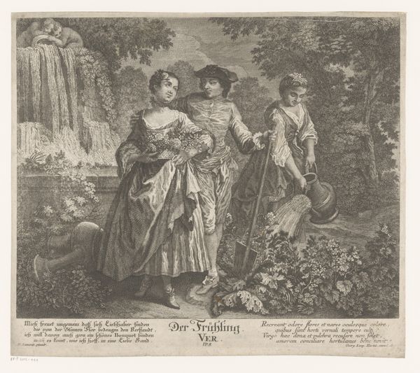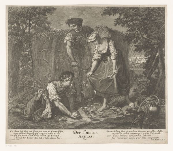 This print, titled "Herfst," which translates to "Autumn" in English, was made by an anonymous artist. The print depicts a pastoral scene, laden with symbolism reflective of its era. At its heart, we see themes of courtship and labor, wrapped in the guise of seasonal allegory. The well-dressed man, seemingly of higher social standing, interacts closely with the woman holding a basket overflowing with grapes, hinting at both the harvest and perhaps, a more intimate yield. Other figures work in the background, grounding the image in the realities of agricultural life, and suggesting the class distinctions inherent in this society. The image evokes a sense of abundance, but also hints at the fleeting nature of beauty and the passage of time. It invites us to consider the complex interplay between desire, social roles, and the ever-changing seasons of life.