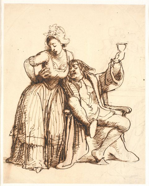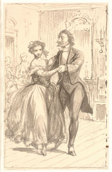 Wilhelm Marstrand made this drawing, “En pige trækker en mand i øret”, or “A girl pulling a man by the ear” using graphite on paper. The rough, unfinished quality of the graphite gives the drawing a sense of immediacy, as if capturing a fleeting moment. See how the artist uses quick, gestural lines to define the figures and their movement, focusing on their interaction rather than precise detail. The texture of the paper itself adds depth, with the graphite catching on the surface to create areas of light and shadow. Consider how the simplicity of the materials emphasizes the narrative. The artist's choice to work with graphite, a common and accessible medium, removes any pretension and brings attention to the dynamics between the figures, highlighting the social commentary with a raw, unfiltered quality. Ultimately, the artwork reveals the power of modest materials to convey complex relationships and social observations, blurring the lines between fine art and everyday expression.