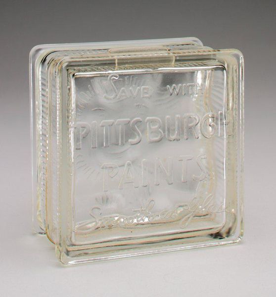 Curator: Here we have a rather unusual object: a glass block functioning as a still bank. It comes from the Pittsburgh Corning Glass Block Corporation, dating back to the 20th century. Editor: First impression? Kind of sterile, almost like something from a sci-fi hospital. But there’s a strange beauty to it. I find its rigid structure oddly appealing. It reminds me of the modernist designs for communal living spaces, or government buildings—there is almost an utopian ideal implied. Curator: It certainly reflects a particular moment in design history, where industrial materials like glass were embraced for their functionality and aesthetic potential. This piece served a dual purpose – showcasing the company’s product while encouraging thriftiness. These objects often were handed out to employees to encourage investing. Editor: True, there's also something melancholic about it. Glass is so transparent, yet also fragile and unforgiving. Imagine all the tiny coins rattling inside over time—all the wishes trapped within this see-through box! It looks like the inscription and designs are embossed onto the face of it? Is that right? Curator: Indeed, the text and branding are molded into the glass itself, creating a subtle yet permanent form of advertisement. Its durability—obviously, the block is built to last—meant that Pittsburgh Corning would have had its name in people's peripheral vision long after they installed any blocks for construction, for example. It became more of a symbolic keepsake over time, once glass block fell out of style, or were viewed as old-fashioned. Editor: Absolutely. Think about how many families might have held this very object? And what it stood for—security, prosperity, the American dream manifested in a block of solid, clear glass. I bet there's even a bit of nostalgic longing bound up in it now. It makes me wish I could hold it to find the answer. Curator: It definitely provides an intriguing look into the intersection of industry, design, and consumer culture, which makes this more than just a still bank; it becomes a historical artifact with multiple layers of meaning. Editor: You know, seeing this piece has me reconsidering everyday objects. A simple glass block becomes a vessel of memories. I love how art challenges us to see beauty in the mundane.