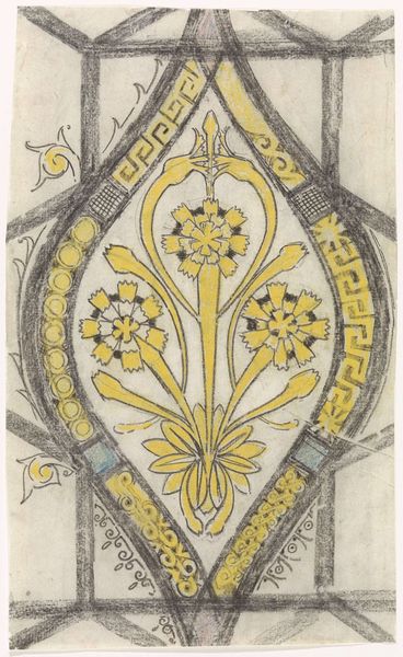 Jules-Edmond-Charles Lachaise designed this decorative panel using watercolor, gouache, and graphite. The panel’s vertical composition is neatly divided into three distinct visual fields. The turquoise bands on either side immediately grab your attention, framing a central beige rectangle. Within this space, botanical motifs rendered in shades of grey, unfold, mirroring one another in structured symmetry. This design is further punctuated by the metallic gleam of gold accents. Lachaise's embrace of rococo’s ornamental style offers a playful dialogue between natural forms and stylized representation. His measured execution also provides an implicit commentary on nature’s order. By arranging the organic motifs with such geometrical rigor, Lachaise challenges the period's aesthetic norms while subtly underscoring its underlying principles of structure and design. Notice how the rigid symmetry of the vegetal arrangement serves to emphasize the harmonious order of the natural world. This artwork invites us to question our notions of ornamentation and nature, prompting a broader reflection on the intersection between artistic intention and cultural expression.