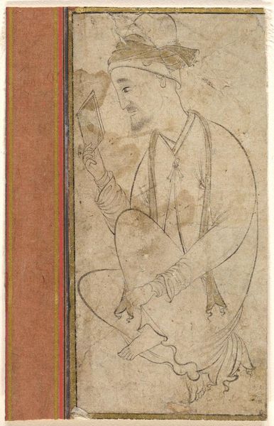 This is a miniature painting titled 'Hoemojoen' by Adrianus Canter Visscher. The artwork commands attention through its minute scale and the formal arrangement of its elements within the frame. The subject, depicted in profile, is contained within a golden border, set against a muted background. The use of color, particularly the contrast between the figure's green garment and pink headdress, draws the eye. The precise lines and subdued palette give the portrait a sense of formality. The subject's representation reflects a semiotic system of signs of status and identity. The halo, although faint, signifies a connection to divinity, while the jewelry and attire suggest wealth and status. The formal elements create an image of someone to be revered. The portrait engages with broader ideas about representation, power, and the construction of identity. The artwork's formal qualities—its scale, composition, and restrained color palette—contribute to a viewing experience that prompts questions about how representation can be at once intimate and monumental.