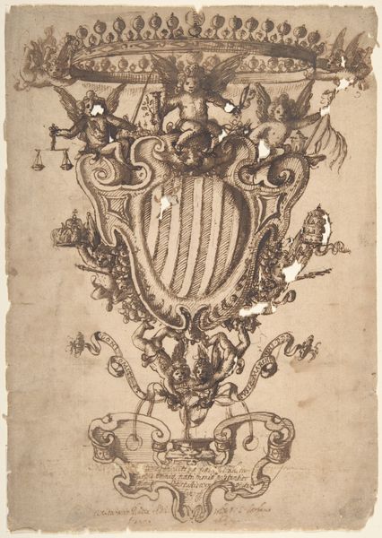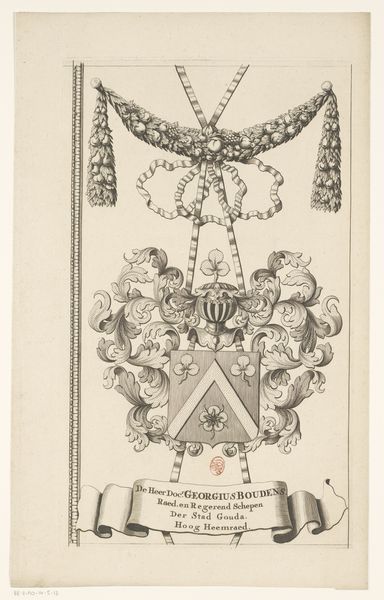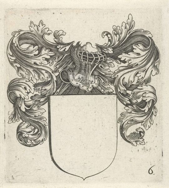 This is a trade card, made by Isaac Vincentsz. van der Vinne in the Netherlands, using woodcut on paper. The trade card is a kind of early advertisement, and it speaks volumes about the rise of consumer culture. Woodcut was a common way of printing images at this time, allowing for relatively quick and cheap production. The stark lines and the contrast between black and white were intrinsic to this process. The image shows three horns within a laurel wreath, topped by a crown and a banner. The horns probably relate to the specific trade, but the laurel wreath and crown are clearly meant to signal quality. This wasn't just an image; it was a crucial tool for vendors to establish their brand. These objects have a humble status as works of art, but are fascinating because they testify to the visual language of commerce. It reminds us to look closely at the relationship between art, labor, and the marketplace.