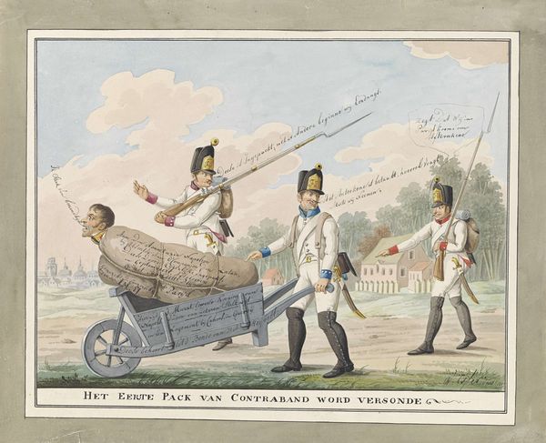 This hand-colored etching, made in 1814 by an anonymous artist, presents a caricatured scene of Napoleon receiving Elba. The composition is organized around the central figure of Napoleon, whose exaggerated stance and facial expression dominate the visual field, immediately evoking a sense of mockery. The artist uses a semiotic system of scale to undermine Napoleon's grand ambitions; he’s offered a comically small globe representing Elba. This plays with the traditional symbolism of globes as emblems of power and dominion. The receding perspective of the background architecture, combined with the diminutive size of Napoleon's figure, works to deflate his once towering presence on the European stage. The etching’s power lies in its destabilization of established meanings. By reducing Napoleon to a figure of ridicule through formal manipulation, the artist challenges the narrative of heroism and authority typically associated with leaders. This artwork functions as a commentary on power, underscoring its fragility and the ease with which it can be subverted through representation.