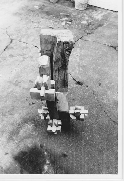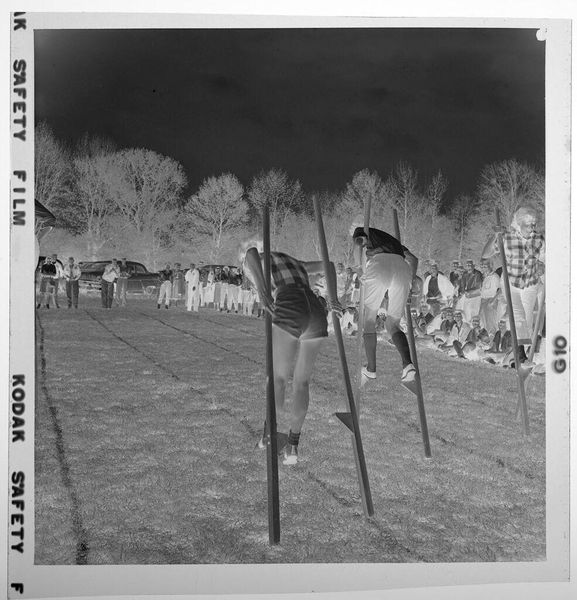 Curator: Jack Gould's Untitled photograph presents a woman in a dice costume attempting to play golf. The gelatin silver print is rather small, only about 5.7 centimeters square. Editor: The stark contrast immediately captures the eye. The dark dice shape against the bright, almost bleached, landscape creates a sense of surreal isolation. Curator: Absolutely. Considering the materials, the low-contrast print suggests a conscious choice to flatten the image, emphasizing the constructed nature of the scene. It begs the question of labor and leisure: what's the social commentary here? Editor: Perhaps. But the dice itself, that perfect cube, dominating the organic forms of the landscape, feels symbolic. Is it chance versus intention, chaos disrupting order? Curator: Interesting points! It certainly invites a broader discussion about the materials of photography and the performative aspect of leisure. Editor: Indeed. Ultimately, Gould's image leaves us pondering the interplay of form and concept.