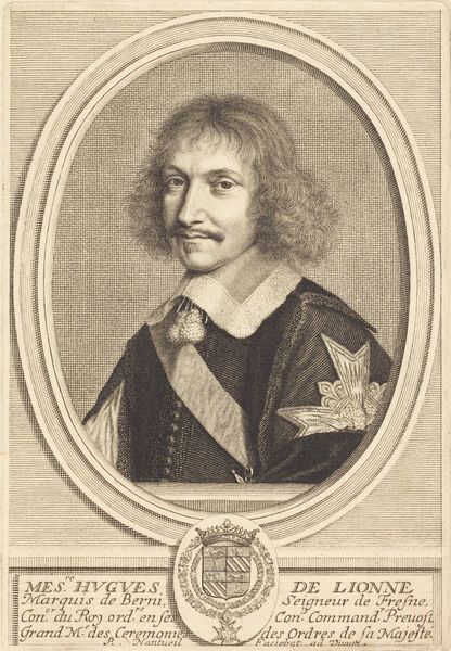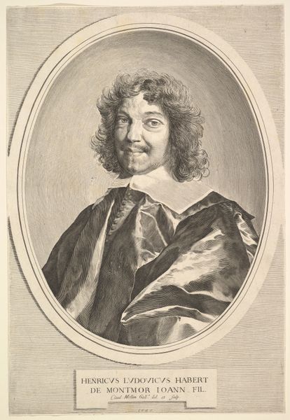 Curator: Before us, we have Claude Mellan's portrait of Henri-Louis Habert de Montmor, currently residing at the Harvard Art Museums. Editor: It has an almost photographic quality, yet the single-line technique creates a surprisingly gentle atmosphere. Curator: Indeed. Mellan's famous for his virtuoso use of a single line, spiraling out from the center to create form and shadow. Montmor, a figure of immense cultural significance, was a symbol of intellectual patronage during his time. Editor: The oval frame reinforces a sense of contained intellect, while the flowing drapery adds a baroque dynamism. It really is a masterful study in contrasts. Curator: Absolutely. And Montmor's confident gaze suggests a man comfortable in his role as a protector of arts and sciences. His image perpetuates the cultural memory of the intellectual elite. Editor: It's a fascinating piece, technically brilliant, but also deeply evocative of its subject's stature. Curator: A lasting testament to the power of art to capture and transmit cultural values.