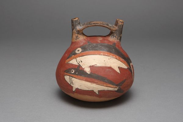 Editor: Here we have a ceramic double spout vessel from the Nazca culture, created sometime between 180 and 500. The earthy tones and repeating patterns of fish, birds, and geometric motifs are striking. It feels simultaneously ancient and incredibly modern. What catches your eye when you look at it? Curator: The whimsy! It feels as though someone was playing, like sketching creatures mid-thought, and look, they are wonderfully odd beings! Birds that dream of fish. Fish dreaming of, perhaps, symmetry? What a quirky thing. Each band feels almost like a page in a visual storybook, doesn't it? I mean, can't you just imagine this artist, hunched over this pot, grinning mischievously? Editor: A storybook! That’s a lovely way to think about it. I was focusing so much on the individual motifs I didn't really see how they came together. Are the spouts symbolic, too, or just functional? Curator: Ah, the spouts. It’s believed these types of vessels were often used in rituals, sometimes placed in tombs as offerings. So the spouts might have served as a sort of bridge between worlds, connecting the earthly contents with the spiritual realm above, a literal outpouring of the spirit, no? Or at least, that’s one delicious way to imagine it. Editor: So the act of pouring becomes a spiritual gesture? I never considered that! Curator: Absolutely! And you know what's so groovy about these objects? They survived. Millennia melted away, and now here they are, grinning at us from across the ages. Editor: I am going to appreciate pre-Columbian art even more now, thinking about these connections!