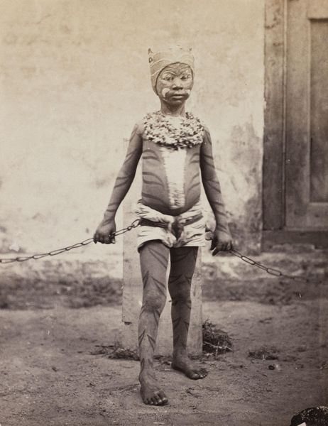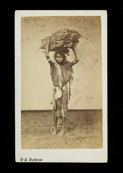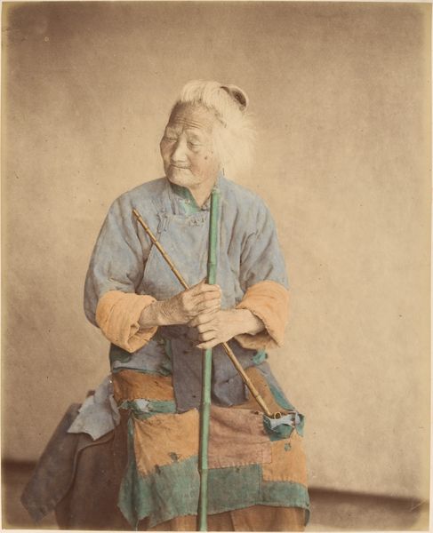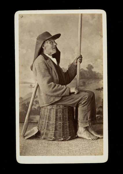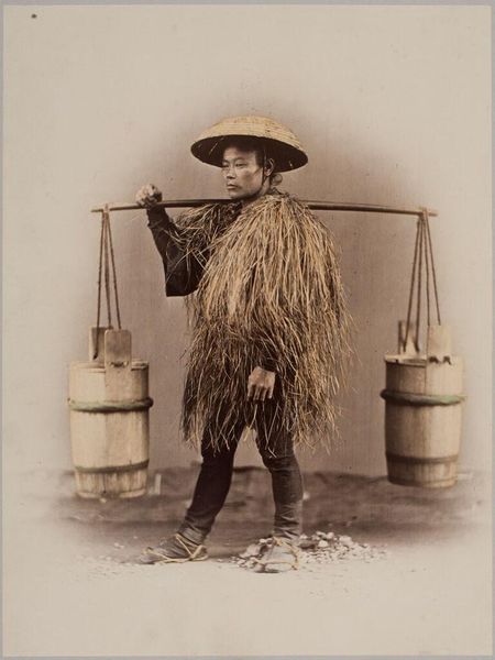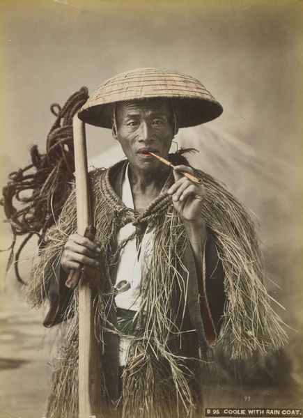 Editor: This albumen print from the 1870s by Suzuki Shin'ichi, titled "Farm laborer with rain coat (mino)," presents a dignified portrait. There's a stillness to it, a quiet strength in the subject's posture, but it also feels staged. What strikes you about this piece? Curator: You’re right, there’s a tension between the constructed image and the real conditions of labor. Consider the Meiji Restoration occurring at this time, a period of intense Westernization. Photography became a tool not just for documentation, but for constructing ideas about Japanese identity for both internal and external consumption. The 'mino,' the traditional raincoat, signifies a connection to rural life, yet the subject's gaze feels carefully posed, distanced from the actual labor it represents. Doesn't it almost exoticize the farmer? Editor: I see what you mean. It’s not just a neutral depiction of a worker; it's performing something. Almost like a stereotype? Curator: Exactly. It raises questions about who this image was created for and what narrative it was intended to convey. Was it to show the 'picturesque' quality of Japanese labor to a Western audience, or to reinforce a certain national identity during a time of rapid change? The very act of photographing someone already implies a power dynamic. Editor: That’s a great point. I hadn’t considered the photographer's role and the implications of ‘framing’ someone in this way. Curator: The clothing becomes more than just practical attire; it transforms into a symbol, loaded with socio-political meaning. And how does that interplay with our contemporary understandings of labor, representation, and cultural exchange? Editor: It gives me a lot to think about. Seeing the portrait as more than just an image but as a constructed narrative changes everything. Thanks! Curator: Indeed! It prompts us to be critical of representation and its relationship to power.