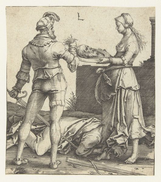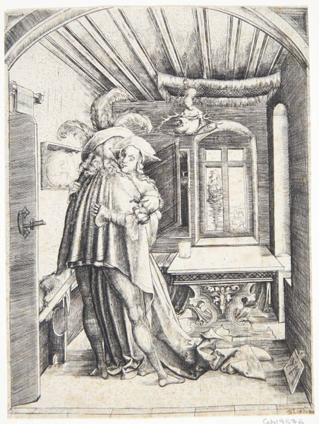 Heinrich Aldegrever created this print, "Tamar Turned Out of Amnon's House," around 1540, using engraving. This was an intaglio process, where the design is incised into a metal plate, ink is applied, and then the surface is wiped clean, leaving ink only in the incised lines. The act of engraving directly influences the appearance of the image. Aldegrever's skill is evident in the detailed textures and tonal gradations he achieves solely through the varying density and depth of the engraved lines. The image is not just a picture; it's a record of the artist’s labor, a translation of a narrative into the precise and disciplined medium of metal. Consider the social context: printmaking in the 16th century was a relatively new technology. It enabled the wider dissemination of images and ideas, contributing to the burgeoning exchange of information and the development of public opinion. This engraving isn't just a work of art; it’s a product of a changing world, one where images could be reproduced and distributed, influencing social and cultural values. It shows how so-called ‘high art’ is inextricable from technological innovation and social shifts.