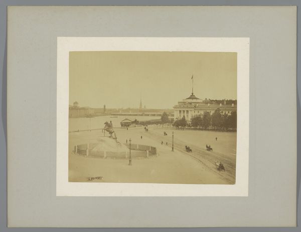 Editor: This gelatin-silver print, "Congreshal aan de Seine tijdens de Wereldtentoonstelling van 1900", captured in 1900, presents a compelling view of a Parisian cityscape. I am drawn to the balance between the architectural elements and the fluidity of the river. What visual aspects stand out to you the most? Curator: Certainly. The photograph displays a fascinating tension between the rigid geometry of the buildings and bridge and the organic movement implied by the water and crowds. Note the almost classical arrangement, with the building acting as a clear focal point, mirrored, yet destabilized, in the river. Editor: Mirrored and destabilized, yes, I like that! It’s almost as if the photograph is playing with our perception of solidity and ephemerality. Curator: Precisely. And consider the tonal range achieved in the gelatin-silver print. The photographer expertly utilizes light and shadow to articulate form and create depth, drawing our eye deeper into the composition. Do you notice how the lines of the architecture guide your gaze? Editor: Yes, the lines create clear vanishing points. Were these types of compositions a common feature of photography at the time? Curator: There was an embrace of capturing urban life during the late 19th-century, focusing on order and aesthetics amidst rapid expansion. The compositional strength resides not merely in recording a scene but in how the photographer constructs visual relationships through careful arrangement of elements. Editor: It is striking how modern it still seems. I learned to look beyond just what’s depicted. Curator: Exactly. Appreciating this work necessitates a move towards grasping underlying design principles and optical choices which make it visually engaging.