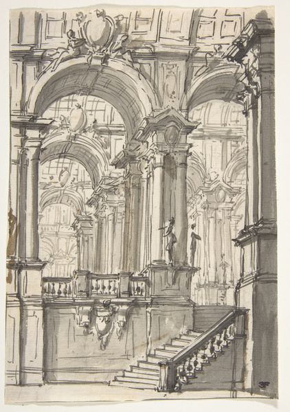 Curator: Let's consider James Holland's "Genoa; a Crowd outside a Church". It's fascinating how the materiality of paper and watercolor serves to depict not just a scene, but the very act of observing it. Editor: It feels like a quick sketch, almost a snapshot. What do you see in this piece? Curator: I see a record of production. Holland isn’t just representing Genoa, he’s demonstrating the processes of artistic labor and travel. The layering of washes and the visible pen lines highlight the speed and efficiency required of an artist capturing a scene for later consumption. Editor: That makes sense. It feels like we are seeing the nuts and bolts of art creation! Thanks!