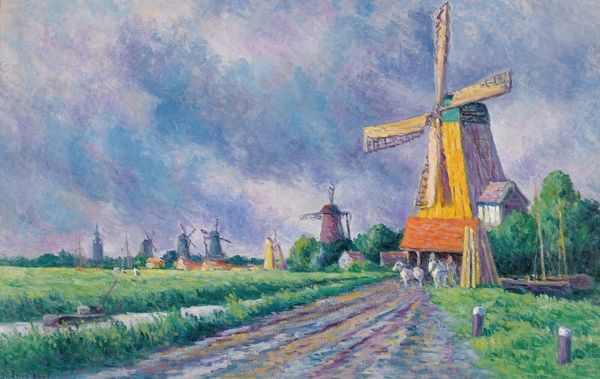 Childe Hassam made "Bending Sail on the Old Mill" with oil paint, and looking at this painting, you can almost feel the hand of the artist at work! The marks are so present – thick, loaded brushstrokes that build up the form of the mill and the sky. It's like Hassam is right there with you, smearing and dabbing, trying to capture the light. I'm particularly drawn to the upper left corner of the painting, where the cloud is. Here, you can see the way the green paint interacts with the light white. It's almost as if he mixed them on the canvas, creating a sense of depth and movement. Hassam reminds me a little of Monet, with his interest in light and atmosphere, but there's something earthier and more grounded about his work. Ultimately, "Bending Sail" isn't just a picture of a mill; it's a record of a way of seeing and feeling the world.
