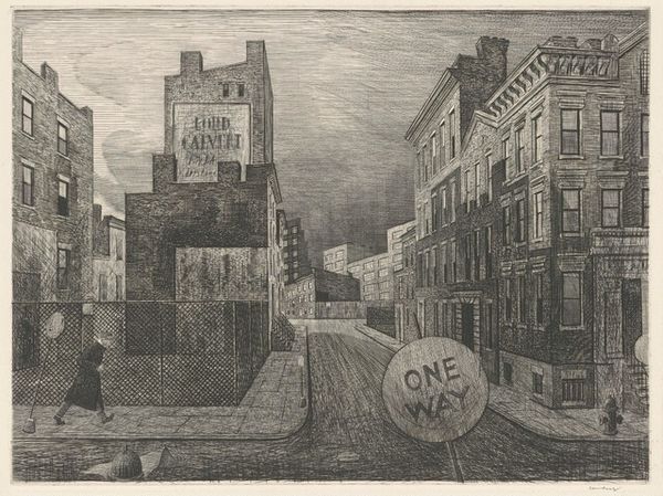 Curator: Salvatore Pinto’s "Power House," a print created around 1935, greets us with stark contrasts of light and shadow. What’s your immediate response? Editor: I’m struck by how raw and industrial it feels. You can practically smell the coal and the steam rising from that stack. There's a palpable sense of energy, even in this still image. I'm drawn to the rough textures suggesting a tactile experience—I wonder, what materials are at play? Curator: Pinto masterfully employed graphite to create this drawing that later served as a model for the final print. He highlights a tension between the imposing architecture of industrial progress, symbolized by the bridge and factory, and the rather obscured presence of people—there’s a lonely figure visible at one window. The scene is heavy with implications about man’s role in a rapidly changing landscape. What do you think about this man looking through a window? Editor: Well, graphite allows for a very specific range of tone and a striking graphic quality once reproduced in print. I see the social commentary you mentioned in the figure, almost swallowed up by the factory's imposing scale. It really pushes us to consider the human element within industrial processes. There is something alienating here—this man inside—suggesting modern anxieties concerning production, scale, and alienation from human contact. The "SSS" repeated above the windows reinforces an abstract, anonymized power. I imagine there is more than one factory with the same symbols. The buildings can stand for many more factories of the era, an anonymous building in any place. Curator: The imagery certainly speaks to a society in the throes of industrialization and its discontents. The bridge itself, soaring above the power plant, suggests a path toward the future. Visually and conceptually it almost overpowers all the rest. In a curious turn, however, the number of windows also grabs my eye and makes me think this factory, a harbinger of progress, seems equally rooted in another era: notice the similarity between window design in this early 20th-century power plant, to the layout of windows in Baroque or Rococo Palaces—it is as if Pinto attempts to bridge past and present. Editor: Absolutely. We must note the social contexts that determine and produce material culture, with their continuous impact over the production process and cultural meaning of prints like this. But also how this culture in itself influences architecture, from bridges to window composition. This dialogue between past and present—we see these echoes constantly repeating in time. What an engaging and dynamic conversation this print facilitates. Curator: Indeed, "Power House" captures a crucial moment in the ever-evolving story of humanity and technology. A landscape charged with ambition and also perhaps, a bit of melancholy.