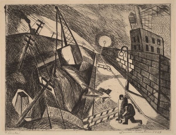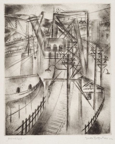 Editor: So, this is Jolán Gross-Bettelheim’s "Bowery," a graphite drawing and print from around 1938. There’s a somber feel to it, almost oppressive with the heavy use of shadow and the grimy city details. How do you interpret this work? Curator: I see a powerful commentary on urban alienation and the socio-economic conditions of the time, particularly during the late Depression era. The Bowery, known for its flophouses and marginalized communities, is presented here not just as a physical space, but as a metaphor for societal neglect. Consider the high contrast – the stark division between light and shadow could represent the deep disparities of wealth and poverty. What feelings does that evoke for you? Editor: It does feel stark. The darkness makes me think about unseen struggles, the architecture towering above. Curator: Precisely. Think about the artist, an immigrant, depicting this scene. This artwork acts as a social critique. How does the use of perspective affect your understanding? Editor: The perspective is very angular, almost distorted, and makes the buildings loom. It does amplify that sense of unease and being overwhelmed by the city. I see that there are people up in the windows in the top right. Curator: Yes, do you get the sense that those figures looking out are observers or inhabitants of the city, trapped or part of a vibrant social system? Their positioning is not accidental, they give us insight. Editor: Inhabitants for sure, looking out, maybe a bit trapped like they are behind bars. I guess the work makes me realize there is still the same division today. Thanks for that observation, I learned so much. Curator: The past and present converge within the artwork’s meaning. It inspires critical consciousness about ongoing social inequalities, and reveals a powerful political intention to critique marginalisation and class divides.