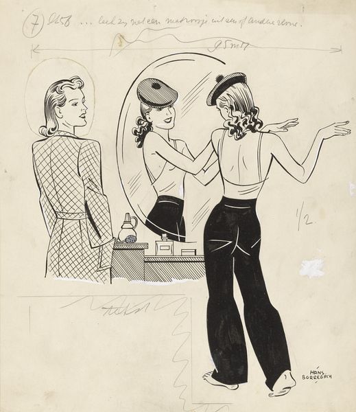 Curator: This drawing by Hans Borrebach, tentatively titled "Pepita operates a light switch at a stage", predates 1948. It's rendered in ink on paper, quite a dynamic piece. What's your first impression? Editor: The contrast is striking. Harsh light beams cutting across the scene, highlighting the glamorous figure of the woman in the gown, juxtaposed with the back view of someone seemingly in charge of the spotlight. I am interested in the means of this production of theatrical image and the making of illusions. Curator: Indeed, Borrebach, known for his graphic work often engaged with popular culture, captures that particular era's fascination with performance. I wonder about the role of women in entertainment at that moment and if Borrebach offers an interesting portrayal of it in this artwork. Editor: I'm immediately drawn to the mechanics. The drawing shows both the artifice, in the figure with her gown and presentation, and the work—the lighting apparatus, the person controlling it. You could even say the image elevates stagehands, who have allowed this fantasy and image to exist. Curator: It's a valid interpretation, considering Borrebach's work often explores the structures behind popular imagery. Notice the style, how the clean lines create almost a stage set feeling. I wonder how he perceived this work versus his others. Editor: The sharp lines and heavy use of ink emphasize the materials involved, and the weight and shape of the figure is interesting given the means by which a performance space is realized, and those efforts often unacknowledged, remain in focus. Curator: We should also recognize the art itself in this period operated through different means, such as prints for newspapers. The politics of imagery in this print speaks directly to how people lived. It makes the moment accessible. Editor: It's a fascinating glimpse into the labor, technology, and visual construction that underpinned entertainment in this period. It underscores the intersection of creativity and technical know-how required. Curator: Yes, this piece prompts one to think about the societal forces driving these forms of expression and the dynamics of image making itself. It definitely provides a unique look at stagecraft. Editor: And how materiality of performance creates these ephemeral yet enduring moments in our culture.