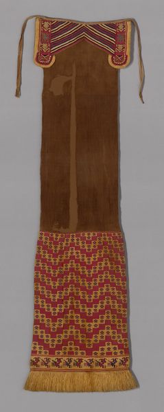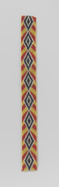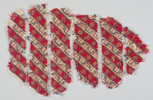 Editor: We're looking at "Bias Cut Fragments," dating back to the 19th century. These strips of patterned textile reside at the Minneapolis Institute of Art. They feel incomplete, like snippets of something larger, yet the intricate wool patterns are really striking. What can you tell me about them? Curator: For me, this work speaks volumes about materiality and labor. Consider the means of production here. The wool itself, the dyes, the weaving – each step represents human effort, most likely by women working within the domestic sphere or in textile mills. The "bias cut" you mentioned also offers insight. It suggests a consciousness of fashion and textile design, of how fabric drapes and moves. Editor: That makes sense. So, it’s less about pure aesthetics and more about the social context of its creation? Curator: Precisely. The "fragments" invite questions: Were these remnants from a larger garment or textile? What was the intended use? Its incompleteness challenges the traditional art historical focus on finished masterpieces, directing our attention to the processes, materials, and lives intertwined with its creation and potential consumption. Do you think the pattern itself tells us something? Editor: Possibly. The repeating shapes do lend it a manufactured or printed impression, despite seeming hand-worked up close. So is the piece about elevating functional textiles as art objects? Curator: Partially. It's more about recognizing that textiles, often relegated to craft, were essential components of daily life, reflecting cultural values, economic structures, and gender roles. This challenges that artificial distinction. Editor: So, understanding the textile's origins adds so much meaning to it, changing it from just an anonymous design into something quite profound. Thanks. Curator: And considering the repetitive patterns alongside the fragmented state allows us to see both the artistry and the industry. Always more to learn.
