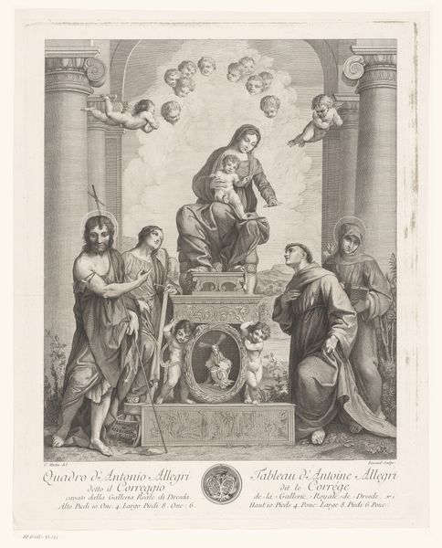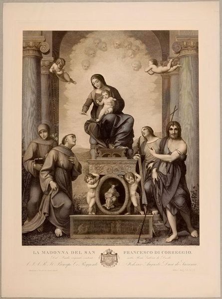 Curator: Let's turn our attention to Peter Lutz's "La Madonna di San Francesco," currently residing in the Harvard Art Museums. It presents a scene of Madonna and child with figures from Christian tradition. Editor: My immediate impression is one of formality, a kind of staged solemnity. The composition is dense, almost claustrophobic, despite the apparent grandeur. Curator: Indeed. And while the subject matter is religious, what fascinates me is how Lutz uses the graphic process to flatten the image, creating a kind of democratization of the sacred. Editor: Interesting take. It feels that rather than demystify, this work elevates the means of pictorial representation. It is really just showing the manual effort required to build up something that appears "weightless." Curator: Perhaps. The layers upon layers of graphic work reveal a process of painstaking crafting... a devotion expressed materially. Editor: Precisely, devotion made visible. And perhaps that's the true subject here - the labor, the process, the material testament to faith. Curator: A thought-provoking interpretation; in essence, the process becomes the art itself. Editor: Exactly. It's about the visible act of creation.