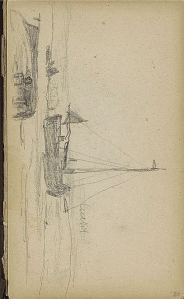 This is a pencil drawing of a boat with a cabin, made by Johan Hendrik Weissenbruch. The drawing is a study, an intimate glimpse into the artist’s working method. It is not highly finished, but rather a quick sketch made in preparation for a larger work. Weissenbruch was part of the Hague School, a group of Dutch Realist painters active in the second half of the 19th century. They sought to capture the landscape and daily life of the Netherlands with a sober palette and a keen eye for natural light. The Hague School artists, like Weissenbruch, turned their backs on the grand historical narratives favored by the art academies, and instead focused on everyday scenes. They often worked ‘en plein air’ and, as such, they helped to transform the social function of art. To understand the place of this drawing, one would do well to look at the institutional history of art in the Netherlands and to consult archives of artist's sketchbooks and letters. Art is not created in a vacuum, and its meaning is always contingent on social and institutional context.