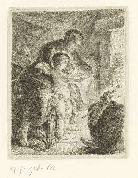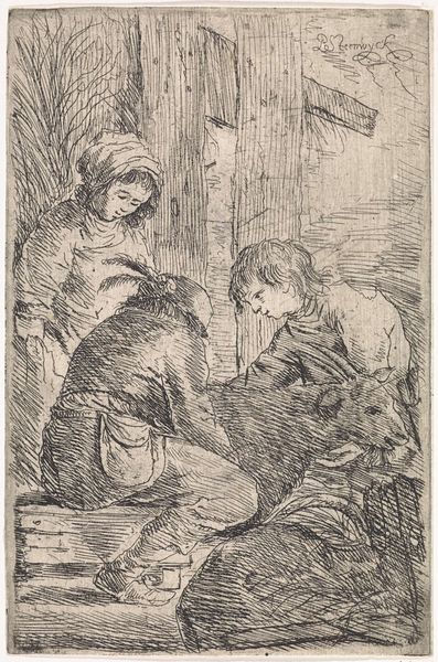 Curator: This is Jacques Dassonville's "Vrouw ontluist hoofd van jonge man," an etching believed to have been created sometime between 1629 and 1670. Editor: The initial mood is certainly unsettling; the scene depicts such raw emotion rendered with detailed intensity, amplified by the strict, almost scratchy lines that carve out the forms. It is both captivating and a little uncomfortable to behold. Curator: Etchings, like this, allowed artists to circulate images widely. Dassonville, a somewhat obscure figure, likely made these prints for commercial distribution. What we see here could represent a common domestic scene, reflecting social realities around hygiene and labour in 17th-century Dutch society. Editor: Let’s focus on the composition itself. The converging lines of the background push our gaze to the figures in the center; notice the subtle details etched into the face of the boy and the woman examining his head, which are highly expressive despite their miniature scale. The restricted palette only furthers the emphasis on form. Curator: Consider what it means to scratch an image onto a plate and reproduce it en masse. It turns an intimate act, the delousing, into a commodity, something bought and sold in the marketplace. And let's not ignore the other figures witnessing this, reinforcing its communal nature and broader implications. Editor: Perhaps, but one could also consider how the light catches the curve of the pot sitting just beside the action; the interplay of light and shadow creates depth that contrasts the foreground's flatness. These formal strategies elevate it beyond mere documentation. Curator: I agree, but the choice to depict this specific labor and these people, subjects not typically found in higher art, speaks to the changing role of art as it reflects daily life and broader economic realities. Editor: So, as we look one last time at "Vrouw ontluist hoofd van jonge man", we realize that the artist’s choice of materials and style adds depth to the mundane. Curator: Yes, and recognizing it as a material object and record gives it further context and value, telling us a story of both production and consumption.