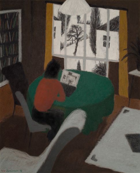 Iwo Zaniewski made this Selfportrait with pastel on paper. The composition strikes us with its interplay of light pastel colours and simplified forms, creating an intimate yet unsettling viewing experience. The artist uses soft lines and a muted palette to define the figures and interior space, evoking a dreamlike quality. Here we see Zaniewski depicting himself attending to a woman, likely a model, set against a backdrop of domestic interiors. The use of colour blocks, such as the blue highlight on the artist's figure and the red chair, draws our eyes across the surface of the picture plane, while the spiral staircase adds a sense of depth and dynamism to the composition. The flatness of the rendering flattens pictorial space, which can be read as a kind of structuralist commentary on representation itself. The artwork's charm lies in its gentle subversion of traditional portraiture, inviting us to question the nature of identity and representation. The composition and the artist's colour and mark making challenge fixed meanings about space, perception, and representation. Art is not static but is continuously re-evaluated, offering space for diverse interpretations.