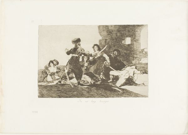 This etching titled 'It is already too late' was conceived by Francisco Goya, a Spaniard, circa the late 18th to early 19th century. It depicts a scene of violence rendered through stark contrasts of light and shadow. Notice how Goya uses aquatint to create tonal variations, heightening the emotional intensity. The composition is structured to emphasize the immediacy of the event. The figures are clustered together in the foreground, their dramatic gestures and expressions pulling us into the unfolding tragedy. Goya’s strategic deployment of line, particularly in the rendering of the figures’ bodies and weapons, injects an unnerving sense of dynamism. This work destabilizes traditional heroic narratives often found in historical painting, replacing them with a raw, unfiltered view of brutality. This challenges the viewer to confront the darker aspects of human nature, disrupting any comfortable distance from the depicted suffering.