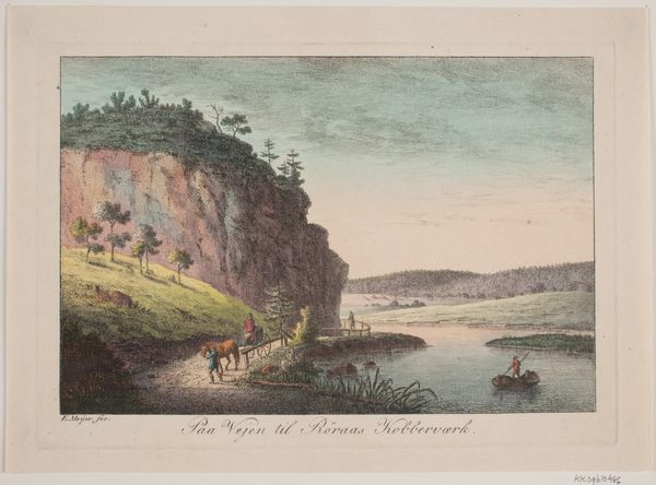 Curator: We are looking at Elias Meyer's engraving, "Paa Vejen til Røraas Kobberværk," made between 1763 and 1809. Editor: The tonal range immediately strikes me; the contrasts are delicate but well-defined, giving the entire composition a tranquil atmosphere, despite the suggestion of labor. Curator: Precisely! Look closely at the linear quality. The process of engraving lends itself well to capturing details of the landscape—notice the rendering of the rocky cliff on the left, and how it contrasts with the smoothness of the water. The texture speaks to Meyer’s skill with the burin. It's important to consider this as reproducible media. How was this work circulated, consumed? Editor: I'm drawn to the figures within the landscape; their placement establishes a rhythm of the working community along this route. Their relative size emphasizes the scale of the copper works against the landscape itself. It implies the imposing nature of the industrial site in this region, dwarfing these people making their way "to Røraas Kobberværk" on foot, with horses and cart, and even by boat. Curator: And, naturally, this location of Røraas Kobberværk implies resources, infrastructure, extraction of value… an engine that creates employment. Think, too, of the copper itself, the commodity, the metal traded internationally that brought this rural community to the eye of an engraver and is now immortalized here at SMK, Statens Museum for Kunst. What was it like for workers on a daily basis? Were there other economic routes tied to these industries that we aren't seeing? Editor: True, the emphasis is on linear elements. It almost flattens perspectival depth—the material of the engraving emphasizes surface over the illusion of three-dimensional space, pulling us into that historical space and demanding a second look. I now observe the artist is interested in more than just documentary. It almost imbues this industrial landscape with something poetic, a specific vision. Curator: Meyer’s artwork gives us more than just a picturesque scene. Considering it, we see an object whose existence highlights the historical intersection of art, industry, labor and nature. Editor: I agree. It reveals something of a sustained, meticulous and quiet observation, far from our contemporary, frenetic imagery, drawing me in.