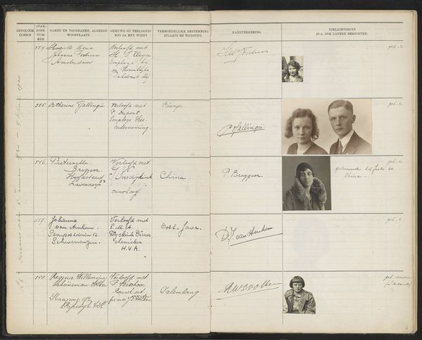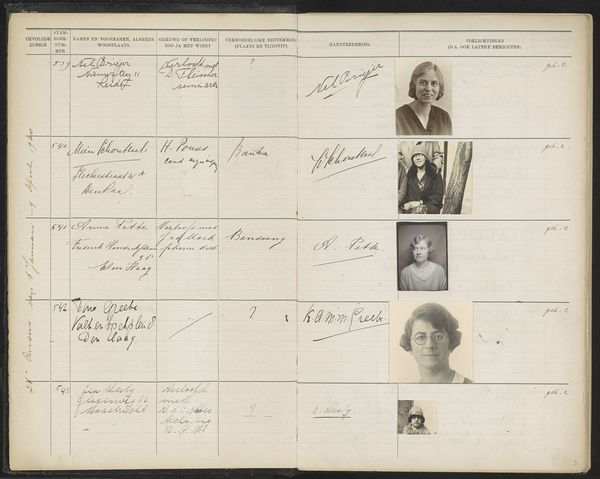 Curator: We're looking at page 4 from "Stamboek van de leerlingen der Koloniale School voor Meisjes en Vrouwen te 's-Gravenhage deel II (1930-1949)," a mixed-media piece including drawings, collage, photography, and print. Its precise date of creation remains a question, but we believe it's from around 1930 to 1936. Editor: It feels so personal, yet institutional. The tight rows of handwritten text juxtaposed with those stiff, posed photographs. It's quite melancholy. Curator: This colonial school held a particular, fraught position within the Netherlands and its colonies. The album's purpose was multifaceted: to record students' identities, their family information, and their placement after graduation, likely determining their futures within the colonial apparatus. Editor: So it’s a snapshot of a very specific social structure and the women who were being prepared to uphold it. I notice how their individual identities—evident in their portraits—are reduced to mere entries, serving a larger administrative function. Is it a critique or reflection of its colonial implications? Curator: It invites that question, certainly. Each face represents a woman about to enter a system that inherently involved power dynamics of race, class, and gender. This album is then both an archive and a testament of an unequal society. We have glimpses into personal histories interwoven with larger forces shaping colonial Dutch society. The juxtaposition really strikes me, don’t you think? Editor: Absolutely. Each photograph is a small act of resistance, a reminder of the individual humanity embedded within such a vast project. Considering this "Stamboek’s" bureaucratic design, one starts to think about what it hides, those stories the archive couldn't or wouldn’t register, about ambition, or resistance, maybe even discontentment. Curator: That’s such a keen insight! It reminds us to constantly question the narratives archives present and search for those absent voices, filling the inevitable gaps. The very existence of this ledger provokes dialogues about the individuals who contributed to it. Editor: Looking closely transforms administrative data into intimate stories, encouraging reflections on intersectionality and the nuances inherent within power systems that influence society's very roots.