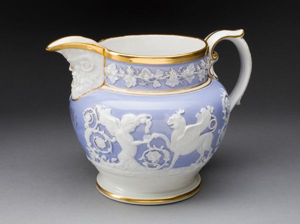 Curator: Here we have a striking piece attributed to Charles Cartlidge and Company, a pitcher crafted sometime between 1845 and 1856. It's currently held here at the Metropolitan Museum of Art. Editor: My first impression is how elaborate it is for something so quotidian. All that raised decoration in gold, it’s a real statement piece. Curator: It’s quite loaded symbolically. Look at how the handle mimics a tree branch and how oak leaves and acorns are strewn across the body of the pitcher. Oak, of course, signifies strength, endurance, and stability, all pretty important national virtues during a time of westward expansion and internal division in the United States. Editor: Absolutely. And then we have the eagle, right above a shield with those vertical stripes – undeniable symbols of American identity. The eagle's beak appears to hold a banner. The stripes are fascinating; the political landscape then was fraught with challenges related to abolitionism and states’ rights—the use of these national emblems here could be seen as a way to shore up unity and project power. Curator: Precisely. There’s a subtle message here, one meant to resonate with people beyond mere functionality. This pitcher, made of earthenware and ceramic, aims to create a cultural narrative within a domestic sphere. Even the colors -- gold, white, and red -- play into the symbolism, hinting at wealth, purity, and courage. It's meant to reinforce certain ideologies. Editor: It’s beautiful but complicated, isn't it? Even in an everyday object, these potters inscribed national myths that papered over a reality filled with exploitation and conflict. Curator: That's a key tension in understanding nineteenth-century American decorative arts. It attempts to project unity and progress. Symbols are used to evoke emotional responses that connect deeply with the viewer and affirm collective beliefs, no matter how contradictory. Editor: Indeed. Analyzing these visual cues offers profound insights into the cultural psyche of the time, allowing us to critically assess the historical underpinnings of our contemporary moment.
