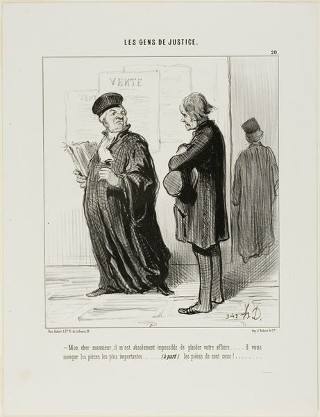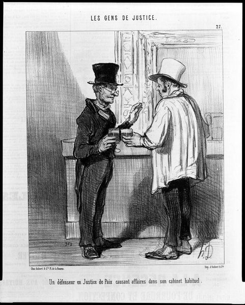 Honoré Daumier created this lithograph, titled 'A defense lawyer at the Court of Arbitration discussing business at his usual office premises' as plate 27 from Les Gens De Justice. The act of toasting, of raising a glass, has ancient roots. It can be traced back to libations offered to the gods in antiquity, a ritual of symbolic sacrifice and communion. Here, it is drained of its sacred meaning to become a sign of corruption. It shows two figures sealing a deal with a shared drink. It’s a motif that echoes through time; consider the Last Supper, where wine symbolizes a sacred oath. Yet, here, the toast is not of unity but of shady dealings. The very act of raising a glass—a gesture intended to convey goodwill—is twisted, laden with the weight of deception and moral decay. The dark humor serves as a mirror to the soul, reflecting the grim realities of human behavior.