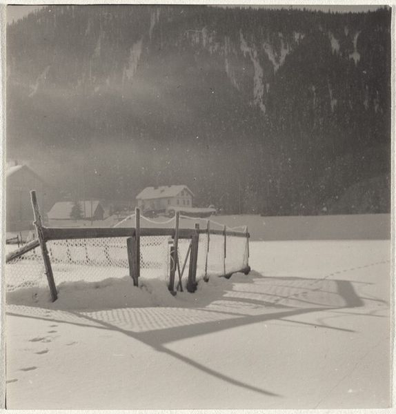 Curator: This gelatin silver print by Robert Frank, entitled "Trees in Snow—Landscape", dates roughly from 1941 to 1945. There's something so simple yet compelling about its stark beauty. Editor: Immediately, I am struck by the texture of the snow. It appears almost sculpted. The contrast between the crisp white snow and the bare branches creates a moody and isolated atmosphere. It almost seems desolate, don’t you think? Curator: Considering it was made during World War II, the desolation might speak to that experience of pervasive hardship, both social and material. Frank, though a Swiss national, probably felt the war's effects on the raw materials for creating his work. Gelatin silver prints required very specific supplies. How were those affected at the time? Editor: It's precisely that scarcity which draws me to it. There's a very basic and raw quality. And Frank chooses a decidedly unspectacular view. There's a whole history of landscape photography depicting the sublime, grand vistas—here we are given humble bare trees, the traces of feet on snow, it's a kind of poetry rooted in the everyday experience. What were institutions and galleries displaying during this period that gave Frank the impetus to photograph in this way? Curator: Great question. Galleries were still showing established, often celebratory work. Something like this might have been perceived as somber, perhaps even too straightforward, without overt symbolism. It presents labor frankly, almost a documentary approach within landscape art, moving away from a constructed idyllic view of the world. And thinking of labor, I wonder how Frank conceived of this landscape through his body, having to trek to the location and developing it himself with the limitations placed by external restrictions? Editor: The physical effort is implicit in the directness. This wasn't captured in a studio. The lack of idealization— the almost casual composition– suggest to me the reality of the making process itself. I now wonder where in Switzerland this was taken? I find the composition more moving, realizing the scene exists outside the boundaries of conflict, untouched, or at least attempting to ignore the surrounding historical context. Curator: This quiet, unassuming scene really offers a space for contemplation amidst such turmoil, highlighting Frank’s ability to find beauty in seemingly ordinary landscapes, regardless of surrounding conflict. Editor: I agree. Thank you for enriching the piece. It feels rewarding to know that our exploration offered a newer reading to someone experiencing art at such an isolated time.