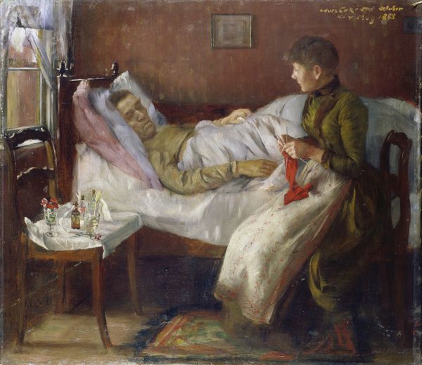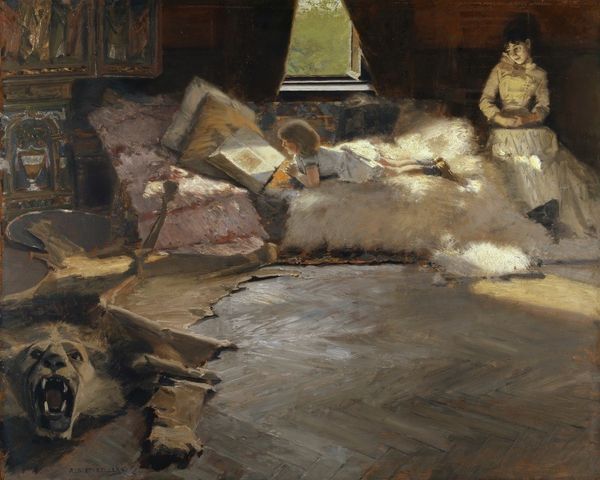 Editor: So, this is "Bouderie," painted in 1880 by Pascal-Adolphe-Jean Dagnan-Bouveret using oil paint. There's this immediate tension that jumps out. He's all sprawled out, carefree, and she looks...stiff, maybe? What's your read on this piece? Curator: Oh, it’s ripe with unspoken stories, isn't it? The air thick with that "something's not quite right" feeling. I get a definite "after the storm" vibe, wouldn't you say? I can almost hear the echo of slammed doors. Notice the dog skin on the floor? It seems very intentionally placed; for me it almost screams, look "We’ve forgotten what it is to be natural!" Or that screen, a floral, frivolous burst amidst the heavier tones, which creates a bit of division between them and makes us focus our eyes upon the two. It also brings this idea about relationships within painting. He has the vibrancy of the foreground, she almost melds with the background. Editor: Wow, that dog skin thing never even occurred to me! It’s fascinating how that domestic element amps up the relational tension. Do you see the painting as more romantic, as per the metadata, or does it read as straight-up realist, focusing on these specific individuals and the setting? Curator: "Romanticism" and "Realism" were strange bedfellows, weren't they? This has that eye for detail of the Realists, definitely. He captures the way light catches the folds in her dress, his somewhat smug repose... But under it all, isn't there that Romantics' yearning for *something more*? Maybe something irretrievably lost? He painted an image to what they once were and where they ended up; I almost feel this separation is to enhance his mind as we have to keep asking “why!”. The romance in life, a genre within our history, an image portraying time. It's a clever blending. Editor: Okay, now I'm seeing it as both! It’s not just a portrait, it’s a *situation*. This conversation totally shifted my perspective. I went from thinking “domestic squabble” to, well, something way more complex. Curator: That’s the joy of art, isn’t it? Seeing the familiar with new eyes. Letting a piece nudge us towards unexpected corners of ourselves.