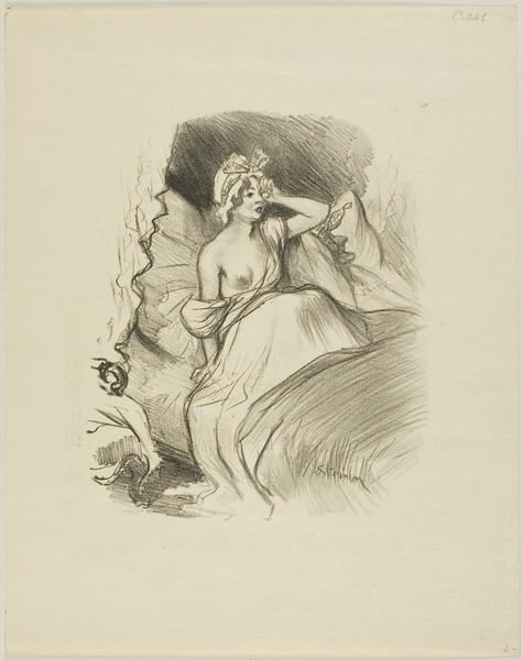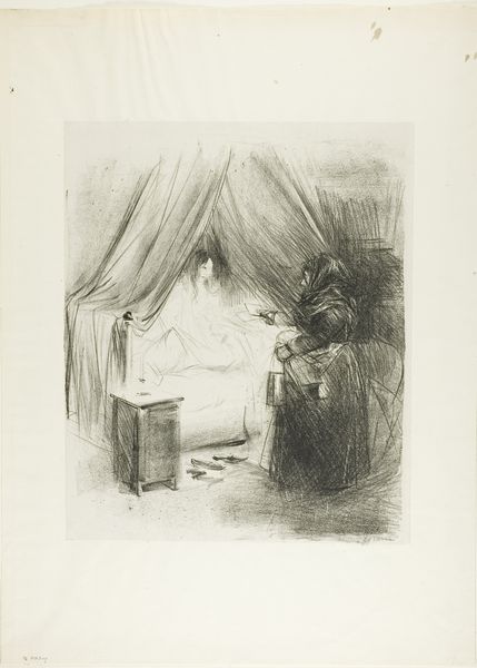 Curator: Looking at Steinlen’s 1900 lithograph “Dame Jacinthe," I’m struck by the immediate contrast between the two figures. There is something melancholic and intriguing about the interplay of characters and emotions on display. Editor: The rough-hewn lines suggest a hasty execution, yet the detail is undeniable. This piece exemplifies the accessible artistry of printmaking. Consider the cost and skill versus painting—allowing Steinlen to democratize his art for a wider audience. Curator: Precisely, and that’s key to its deeper meanings! Observe the symbols: the youthful Jacinthe, presumably in her boudoir, confronted by the older, heavily-veiled woman. It speaks of a fraught transition, perhaps from innocence to experience. This scene is heavy with symbolism that is not so explicit but palpable. Editor: The choice of lithography is also symbolic, right? How the labor mirrors that relationship—Jacinthe represents commodity—the process a kind of 'social critique' of their class structures and their interactions that reflects a keen observation about the conditions of labour? Curator: A fascinating point! Note, too, the heavy shadow, creating dramatic contrast that heightens the emotional tension and also, let's remember Steinlen's background in poster design: its mass-production meant to engage an expansive social strata. It gives "Dame Jacinthe" particular nuance. Editor: Definitely. Think of the resources required for lithography then, like, paper and specific types of pencils—it reveals insight into fin-de-siècle consumer culture. Curator: Absolutely! Plus, that’s important context when looking for broader meaning: “Dame Jacinthe,” as a product and artwork that speaks for a time that witnessed seismic economic change, shows us a snapshot of then-modern France’s society, values, class and economics. It asks how art captures that world. Editor: So, Steinlen’s image embodies production and commerce? From its materiality, that tension makes "Dame Jacinthe," well, a little gem. Curator: Precisely! And those potent symbolic implications create an enduring image that prompts discussion, even now.