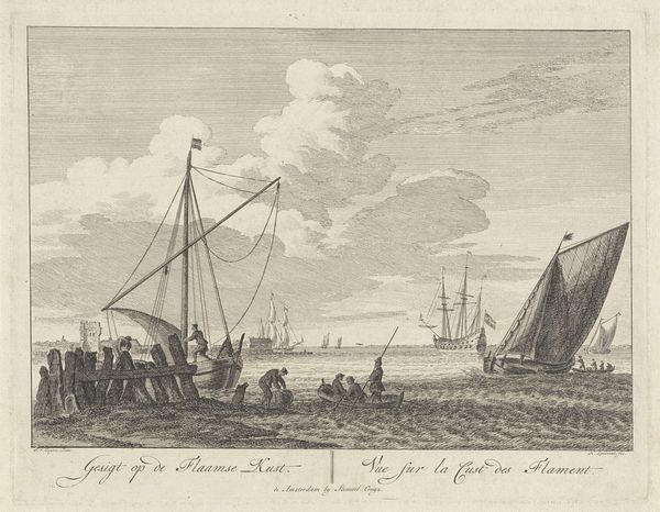 Curator: Here we have "Scene on the French Coast," etched by J.M.W. Turner in 1807, as part of his ambitious "Liber Studiorum" project. It exemplifies the romantic landscape tradition. Editor: Ooh, I get a slightly melancholy vibe immediately. The sepia tones give it such a dreamy, almost wistful feel, like looking at a faded memory of a place long gone. Curator: Exactly! Turner envisioned this series to categorize landscape painting—historical, architectural, pastoral, marine, mountainous, and epic. Think of it as Turner creating his own artistic canon. This particular image blends elements of history painting with a tranquil marine setting, so the epic feel would make sense to the time period. Editor: Well, you can practically smell the saltwater air! Look at those boats – there's a real story in that gathering, something happening, or about to. Almost feels staged, doesn't it? Curator: "Liber Studiorum," meaning Book of Studies, demonstrates Turner's focus on tonal relationships and the inherent drama found in nature. It was meant to assert the landscape's claim to the same intellectual weight as history painting during a period where the Royal Academy largely prioritized history over landscapes. Editor: See, I’m just drawn to the contrasts - the rough textures of the sand and the refined lines of those soaring sails. The details with the horses and the people creates such an earthy scene on what looks to be an ethereal day at sea. It gives the viewer so many opportunities for personal stories! Curator: Indeed. This print reflects broader artistic and cultural shifts, notably the rising appreciation for landscapes and their connection to national identity. Turner helped promote a growing appreciation for landscape as something that should receive institutional acceptance. Editor: So in short, Turner made nature something fancy enough to go in a museum! I’ll buy that – it made an artist out of me, too. Curator: I suppose you could say that! It is truly an innovative fusion of natural observation and artistic idealization! Thank you for your perspectives. Editor: My pleasure! This piece made my imagination float right out to sea.