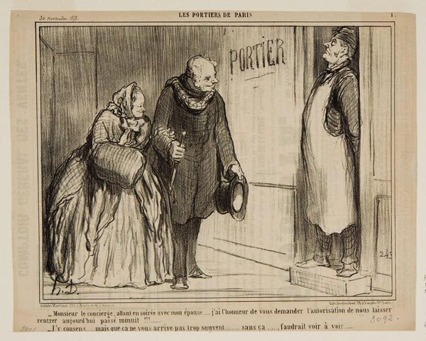 Editor: So, this is "A Mistake at the Odéon" by Honoré Daumier. It looks like a lithograph, and it captures a frantic moment. What do you see in this piece that speaks to its time? Curator: Daumier often used his art to comment on Parisian society. This print, likely from a newspaper, critiques the bourgeoisie's relationship with theatre. Notice the dramatic expressions, contrasting sharply with the perceived artificiality of the stage behind them. Do you think it reflects a genuine emotional response, or something else? Editor: It feels staged, even their panic seems performative. I guess Daumier is mocking their obsession with appearances. Curator: Precisely. He highlights the performative nature of social life itself. It makes me wonder what tragedies, real or imagined, were unfolding outside of the theatre. Editor: That's a great point, it gives a wider scope to the artwork. Curator: Absolutely, it makes me think about art's role in shaping public opinion.