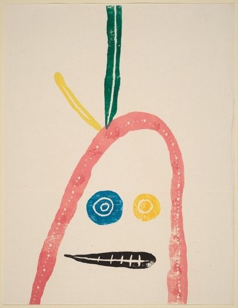 Curator: Here we have Joan Miró's "Untitled [plate XXIX]" from 1958, a mixed-media print and collage work. What's your initial impression? Editor: It feels playful, almost childlike in its simplicity. There’s a strange sense of a figure present, even if it's just through suggestion. Is that intentional? Curator: The arrangement certainly evokes a figure, but let’s focus on the structure. Observe the use of line – the horizontal bars contrasted against the bold, almost calligraphic strokes of colour. Notice too, how the colour creates a visual tension – red against blue, black adjacent to pink. The texture further enhances this complex field. Editor: The geometric forms definitely structure the piece. Yet these simple shapes carry a lot of symbolic weight. That almost looks like a person or perhaps a primitive god figure, what do you think? And what’s with that bug-like form above the pink circle—some kind of bizarre antennae? Curator: That's an interesting reading. From a purely formal standpoint, one could argue that the “bug-like form” balances the composition. Its darker tone mirrors the grounding provided by the solid shapes near the base. Its a carefully considered set of graphical problems and formal solutions that exist independent of subject matter. Editor: But doesn't Miró deliberately tap into a universal visual vocabulary? The fragmented face atop a figure with outstretched arms - these aren’t arbitrary shapes. There's a primal symbolism here; possibly of sacrifice or ritual… Curator: I find it hard to ignore Miró’s command of shape and form, and how he articulates planes of colour against each other. See how that vivid yellow connects those otherwise separate structures into one coherent whole. Editor: Perhaps the genius lies precisely in how he merges primal, near-archetypal imagery with pure formalism, producing a tension between conscious and unconscious meaning. Curator: Perhaps, in works like this, the artist challenges us to seek significance both within the language of art itself and in the realm of visual association. Editor: A good way of bridging our viewpoints on this engaging piece! It gives a new way of perceiving how signs interact within culture, psychology, and art history.