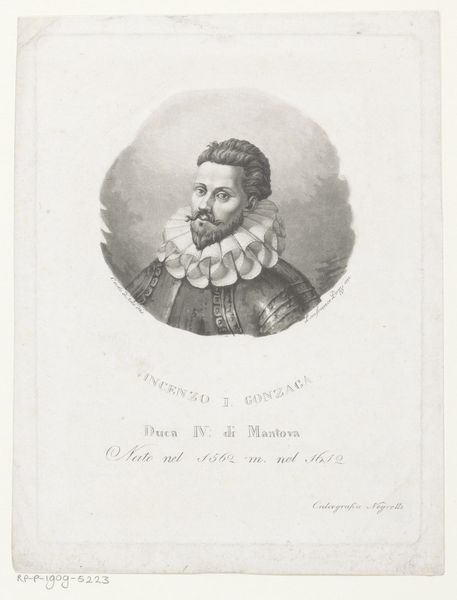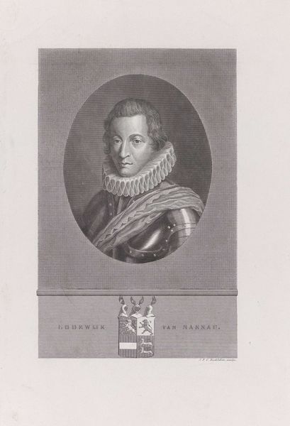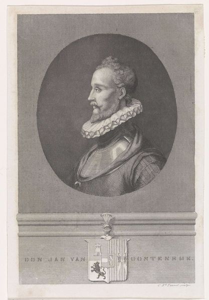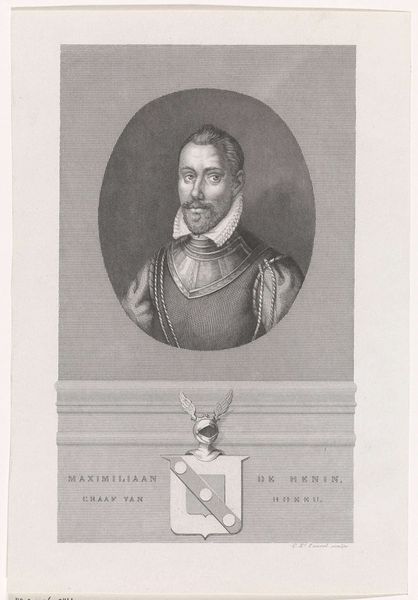 Curator: Let's discuss this striking portrait, crafted by Edouard Taurel between 1841 and 1879. The work, residing here at the Rijksmuseum, is entitled "Portret van Alessandro Farnese, hertog van Parma". Editor: My immediate impression is one of imposing formality. The figure's gaze is intense, his posture rigid. The tight ruff around his neck seems almost like a physical barrier, reinforcing his authority. Curator: Alessandro Farnese, Duke of Parma, was indeed a significant figure—a military leader and governor of the Netherlands during a turbulent period of religious conflict. Taurel's engraving speaks to that complex history, particularly regarding power structures and the representation of male authority. Editor: Precisely. Observe the meticulously rendered details. The crisp lines of the engraving capture the textures of his armor and the intricate folds of the ruff. The use of light and shadow gives the portrait a three-dimensional quality, lending gravitas. It's almost a classical ideal realized through the precision of metal. Curator: And beneath the portrait we see his heraldic shield—a potent symbol of family lineage and the social hierarchies of the time. It speaks to the interweaving of power, bloodlines, and visual representation. How do such images shape our understanding of figures like Farnese, both then and now? Editor: Absolutely. The visual language employed here is calculated to project dominance. Notice the careful composition: the oval frame around his head, set against the more rigid architectural setting of the print, it isolates and elevates the Duke. Curator: For today's viewers, confronting the legacies of these historical figures requires critical engagement. Whose stories are being told and, equally important, whose are being silenced in such portrayals? Editor: A compelling point. Looking beyond the immediate grandeur, the rigid pose and intense gaze, invite a more critical viewing. We could consider how the artist, through masterful execution, elevates a subject entangled with a complicated history. Curator: By delving into the social and political contexts, alongside an understanding of the visual construction, we glean deeper insight into art's multifaceted role in shaping history. Editor: Indeed. Form and context are mutually illuminating; our close looking, revealing far more than a likeness of a man.
