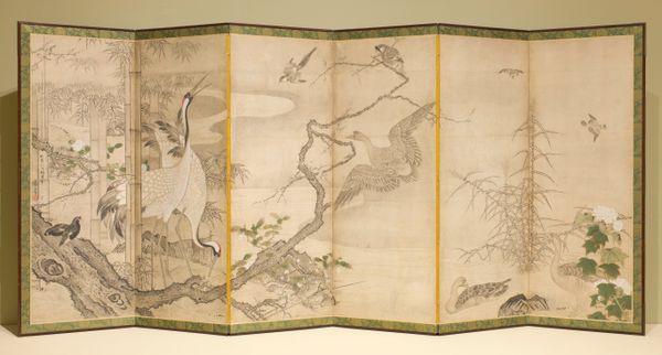 Ogata Kōrin created these folding screens of ink, color, and gold leaf on paper during the Edo period in Japan. This was a time when Kyoto was the cultural and economic center, a place where artists like Kōrin could merge traditional art with new aesthetic visions. Kōrin came from a family of textile merchants, allowing him to develop a unique artistic style. The serene landscape of Cranes, Pines, and Bamboo, resonates with cultural symbolism. Cranes, often seen in Japanese art, embody longevity and good fortune. The pine and bamboo symbolize resilience and flexibility. Kōrin doesn't just maintain tradition, he also uses it, bending it towards a newer aesthetic. Rather than a literal depiction, Kōrin simplifies the forms, focusing on color and composition to create a rhythmic visual experience. This work mirrors the social and economic shifts of his time, marking a shift from the austerity of previous periods to the decorative inclinations of the Edo era.