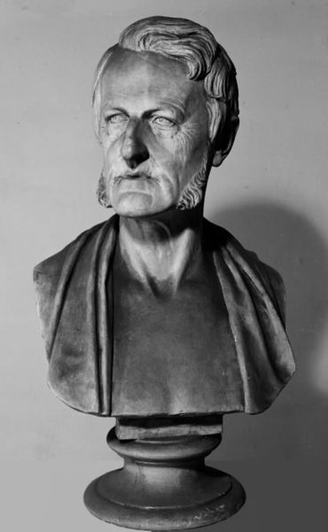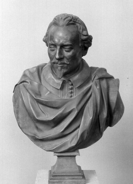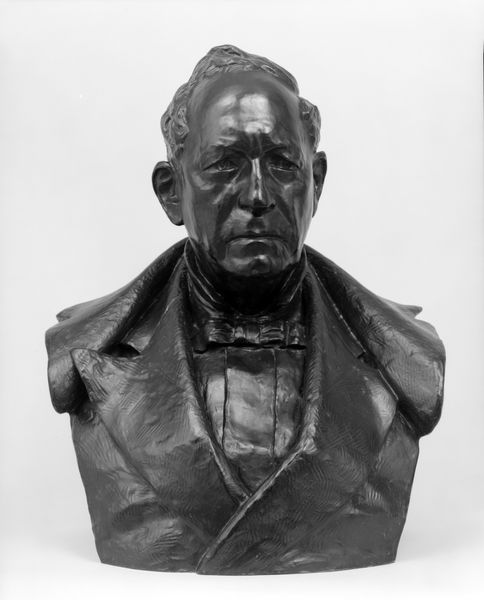 This is a plaster bust of Kgl. skuespiller Emil Poulsen, created by Louis Hasselriis. The cool grey tones and textured materiality invite a close observation of its form and expression. Hasselriis has masterfully used the plasticity of plaster to capture the texture and detail of Poulsen’s features and attire. The artist pays particular attention to the nuances of Poulsen's face and clothing, using this semiotic system of dress to communicate his status. The details—the contours of his face, the set of his mouth, the arrangement of his jacket and cravat—converge to project an image of respectability and artistic sensibility. The gaze is direct, the face serene. Consider how Hasselriis has shaped the plaster to explore the relation between representation and perception. This exploration of form reflects broader concerns about how we construct meaning through art, inviting us to contemplate not just who Poulsen was, but how the artist chose to represent him.