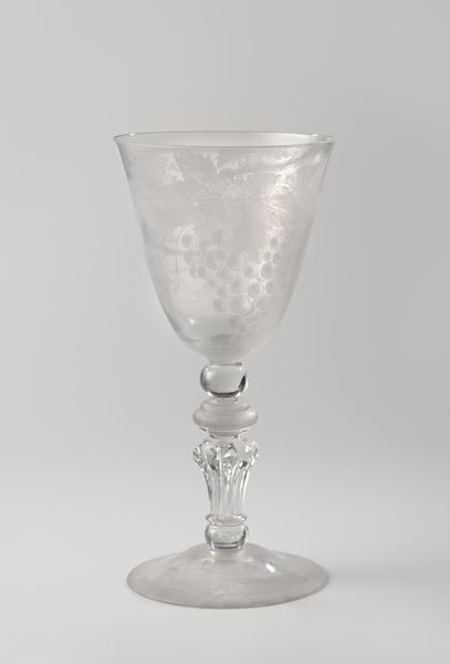 Editor: This delicate object is titled "Kelkglas met een ornamentrand," which translates to something like, "Goblet with an ornamental rim." It's estimated to be from between 1725 and 1850. Looking at it, the ornamentation is subtle, and I'm wondering about its intended use, it feels precious! What whispers to you as you observe this fragile beauty? Curator: Oh, whispers indeed! To me, it hums a quiet song of celebration and reflection, doesn't it? Imagine holding this glass, filled with wine perhaps, during a late-night conversation by candlelight. It’s not just a drinking vessel; it's a memento of a particular moment. And have you noticed the way the artisan played with the glass itself, manipulating light through those blown spheres on the stem? It makes the glass almost like liquid light captured in solid form. It reminds me of capturing dreams; fragile, fleeting, beautiful. Editor: Absolutely! The stem is beautiful. When you talk about candlelight, and the craftsmanship, I'm curious – what kind of status symbol might this have been? Curator: Well, certainly owning such a delicate piece signaled refinement. Glassware of this quality required skilled artisans, and of course, a patron willing to invest. But I wonder, could it also hint at a connection to something deeper? Baroque art is filled with symbolism, reflections on mortality and pleasure. Editor: It hadn't struck me that way before, seeing it as part of a memento mori. Now, the fragile nature of glass makes me reflect on how precious life can be! Curator: Yes! And maybe this is where art and life blur. Seeing our own vulnerabilities reflected. This goblet, far from just being decorative, might invite us to slow down and consider life's transient beauty, even as we are savoring a delicious wine. Editor: I see what you mean! It is definitely more than meets the eye. I will think about it from a different point of view now!