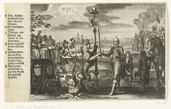 Editor: This is an engraving made between 1624 and 1626 by Daniël van den Bremden, currently at the Rijksmuseum. It's titled "Allegory on the rejection of peace proposals made by Peckius on behalf of the Spanish King, 1621". The intricacy of the line work is stunning. I'm curious, what catches your eye when you look at this piece? Curator: As a materialist, I'm immediately drawn to the means of production. This print, an engraving, makes it inherently reproducible and widely distributable, meaning the ideas represented within could be disseminated to a large audience, becoming a tool of political discourse. Consider the labor involved in its making, each line meticulously carved to create this dense image. Who was this message really for? Editor: That's a great point. So, the fact that it's a print elevates its social purpose, in a way? Curator: Precisely. Look at the allegory itself. We have these figures clearly labeled: The Pope, King of Spain, the Dutch Lion... this isn’t just aesthetic art. It directly engages with power structures and the ongoing conflict, the Eighty Years' War. The printing process makes that political message physical, turning a debate into something tangible. How do you think this materiality informs our reading of the piece? Editor: Well, knowing it could be reproduced changes my view. It’s not just a statement, it's propaganda meant to sway public opinion! The details of the manufacturing and dispersal process suddenly seem so crucial. Curator: Exactly! Think about the cost of the paper, the skill of the engraver, the networks of distribution—each aspect played a part in shaping and solidifying these political ideologies. It's a conversation between material and ideology. Editor: This really encourages a new line of questions when approaching art; focusing on how it was made, distributed and how that impacted the message being conveyed. Curator: Indeed. Seeing art as a product of labor, and a force *in* social production, changes everything.