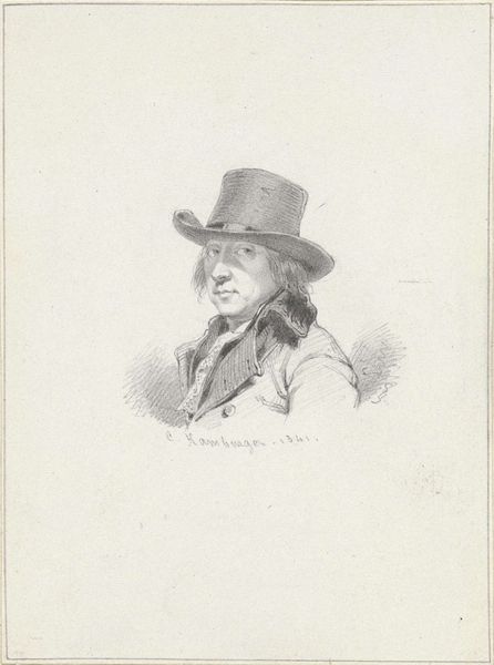 Editor: Here we have a piece called "Portrait of Abraham Bosse," a drawing etched on paper by Anton Graff, and currently held at the Art Institute of Chicago. The first thing I notice is the hat—it’s quite tall and unusual! I'm curious, what details stand out to you in terms of its visual structure and formal elements? Curator: Precisely. Focus on the intrinsic elements of the work: The density and distribution of lines define the figure. Notice how the hatching varies to create areas of shadow and light, effectively modelling the subject’s face and clothing. Also consider the figure-ground relationship: The etching emphasizes the sitter’s presence. Editor: I see what you mean. The intricate line work really gives the portrait dimension, especially around his face. Can we dive into that? Curator: Indeed. The artist's approach to form is highly calculated. Observe the texture generated in areas such as his coat, as opposed to the blank area. It is important to examine the oppositions, to contrast textures and the tonal value in this engraving, noting its formal, not expressive properties. How might those properties have shaped our reception of the work during this period? Editor: Well, now I'm looking at it more as a calculated arrangement of lines and textures rather than just a simple portrait. Thank you for showing me the intricacies in its formal composition! Curator: And you have provided an interesting interpretation of it’s content, allowing us to see it from new angles.