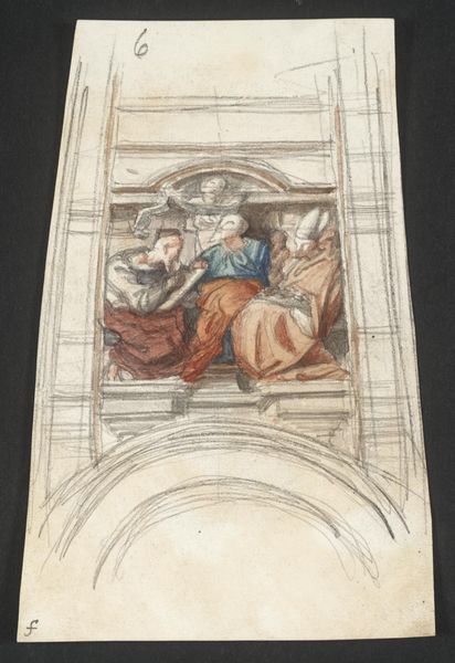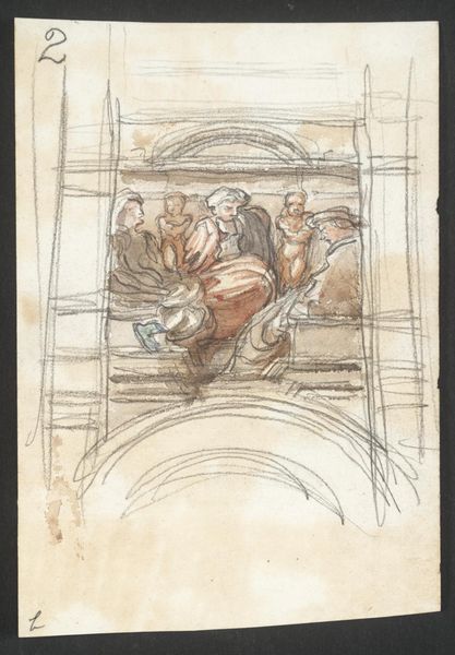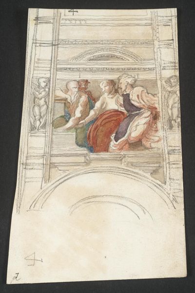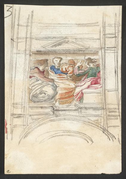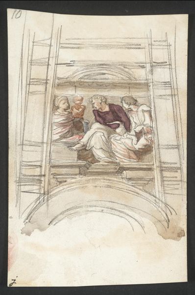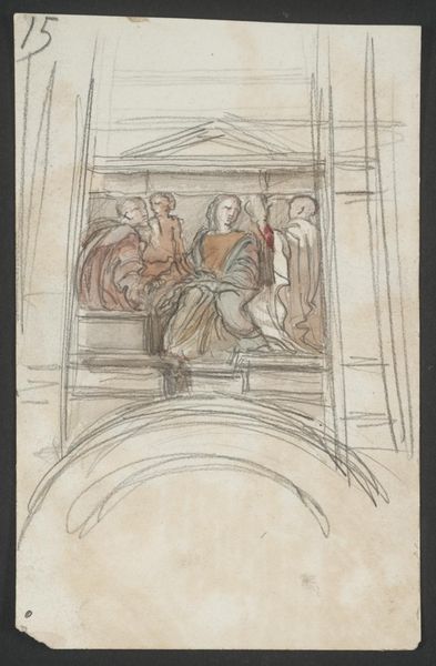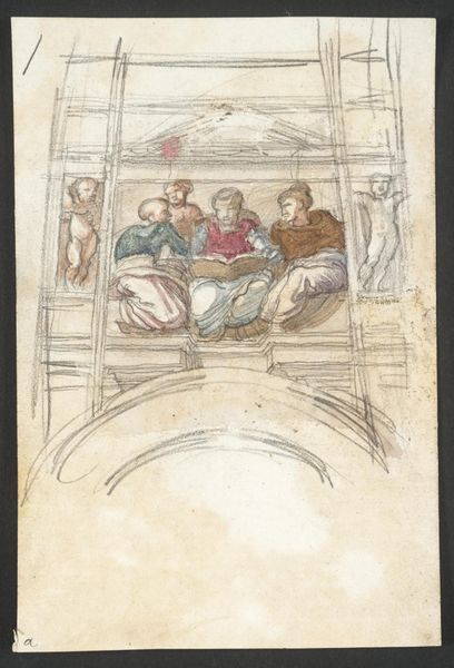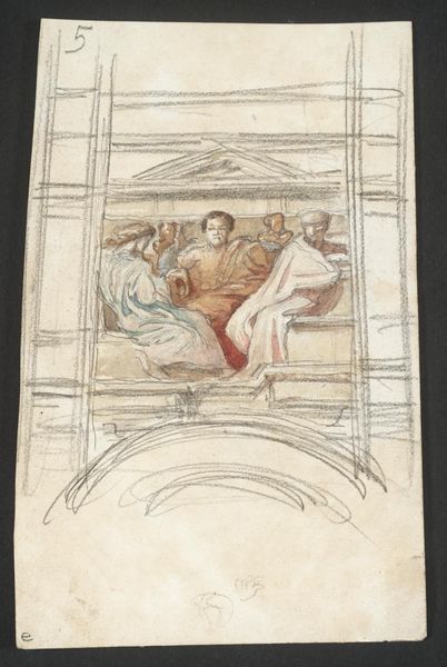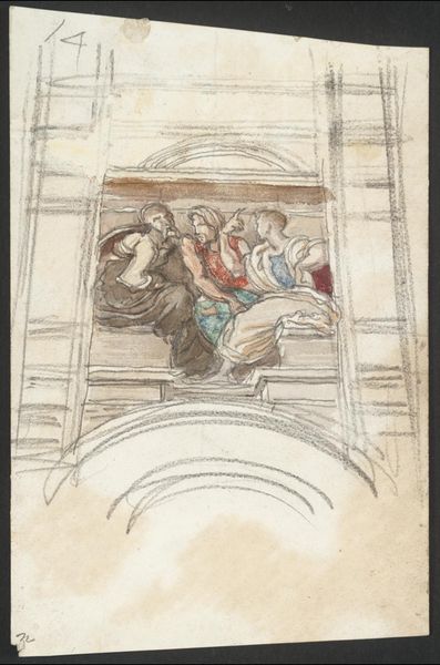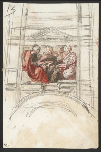 Editor: This sketch by Reuben Townroe shows three figures in what looks like a classical setting. The lines are loose and suggestive. What kind of stories do you think this scene tries to tell? Curator: This work allows us to explore the male gaze and power dynamics within Victorian society. Consider how women were often idealized, but simultaneously denied intellectual agency. Does the sketch perpetuate or challenge this representation? Editor: I see what you mean. The woman appears to be placed on the same level with the men, maybe the artist is trying to promote equality between them? Curator: Exactly! Perhaps Townroe critiques the established social structure, using art as a vehicle for advocating change. Editor: It’s interesting how art can be seen as a form of activism. Curator: Indeed! It shows us how art can transcend mere aesthetics to comment on social realities.