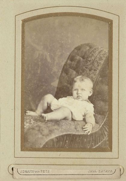Marius Rouffiac created this carte-de-visite of Henri Ernie as a baby with photography, a relatively new technology at the time. The image, small enough to fit in a pocket, speaks volumes about representation and identity. Photography in the 19th century was often a display of status and a way to preserve images of loved ones. This formal portrait of a baby, seated stiffly and dressed in a frilly garment, is a window into the rigid gender roles of the era. While the child's expression is unreadable, the setting—an ornate chair and carefully chosen outfit—suggests a desire to project an image of bourgeois respectability. The choice to photograph Henri as a baby, is interesting as it reflects a cultural trend to capture every stage of life, marking identity from the earliest age. This intimate yet formal portrait captures a moment in time, reflective of the Victorian obsession with memory and the performance of identity. It reflects the societal gaze upon children and the expectations placed on them from the start.