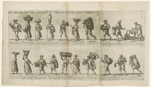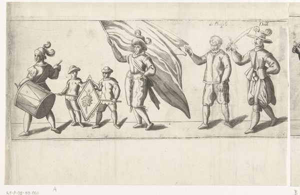 Curator: Let's take a closer look at this fascinating print housed here at the Rijksmuseum, titled "Procession of the Flemish Chambers of Rhetoric De Orange Lelie / De Witte Lelie from Leiden (first part)," created in 1607. Editor: My first impression is that it looks a bit…fragmented, almost like scenes snipped from a longer narrative. The stark black and white, the linear details, give it a feel of reportage. Curator: Precisely. This etching gives us a glimpse into a significant cultural phenomenon of the Dutch Golden Age: the Chambers of Rhetoric. These were amateur literary societies, and this print documents their festive processions. Consider how popular theater and public spectacle played vital role in shaping communal identity. Editor: So, these processions were as much about display as they were about celebrating art? I'm drawn to the rendering of fabric – the way the engraver uses cross-hatching to create depth, especially on the flag. It's such an everyday material elevated through skill and meticulous work. What about the audience for prints like this; who was buying and consuming them? Curator: It’s likely that members of the Chambers of Rhetoric themselves, or those affiliated with the political entities supporting them, would have purchased prints like this to commemorate the event. Also, this print acted as a means of advertisement. Public performances of this kind of celebration could involve several different trades and vendors. This in itself indicates how arts such as play-writing would support local economies at the time. Editor: It makes you wonder about the lives of the artisans involved. What kind of social mobility was possible through such work? Where would they get their supplies, their patronage? Also the inclusion of musical instruments! How many craftsmen would be necessary to supply an entire event, with such rich musical support. Curator: Absolutely, this artwork encourages us to explore the network of human interaction that underpinned its production and its social function, moving past a romantic view of "high" art to consider the labour, materials, and societal factors in creating works that bolster and enrich civic life. Editor: Well said. This image does capture that blend of artistic endeavor and the nitty-gritty of getting it all made. Curator: It's always a dance between inspiration and labor.