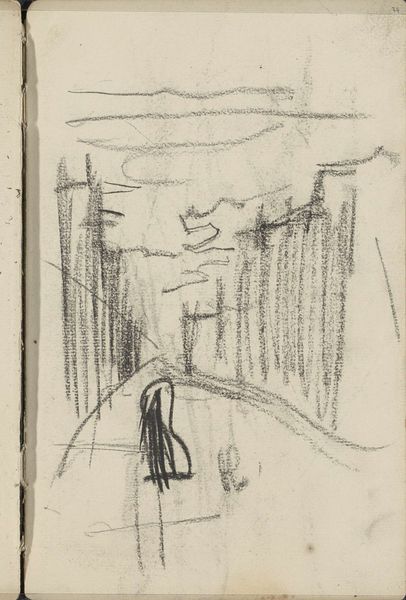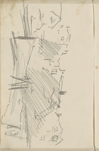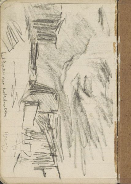 This is a graphite sketch of a possible cityscape by George Hendrik Breitner. The material itself – graphite – is key here. Think of it not just as a medium for capturing a likeness, but a direct trace of the artist’s engagement with the world. Notice how Breitner is not trying to give us a polished, picturesque view. Instead, the marks are raw, conveying a sense of immediacy. The rapidly hatched marks suggest that the artist was working quickly, trying to capture the fleeting atmosphere of a specific moment. The sketch becomes a document of the artist's process, rather than just the end result. Breitner's approach reflects an interest in the everyday life of the city, which he captures with a directness that goes beyond conventional artistic techniques. These sketches, though simple in material, reveal an important part of Breitner’s artistic practice, and his attention to the rapidly changing urban landscape.