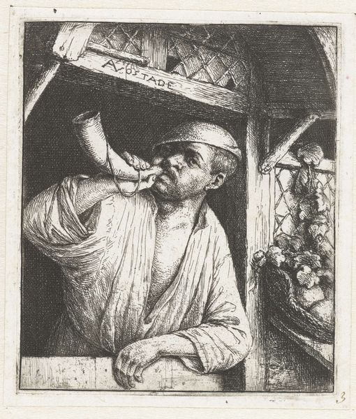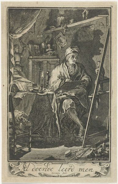 Curator: This etching is attributed to Johann Heinrich Lips, titled "Dr. Faustus (?)". It depicts a scholar gazing at a radiant symbol. What do you make of the subject's intense focus? Editor: It feels like he's searching for answers, almost desperately. Is this about the dangers of forbidden knowledge? Curator: Precisely. Consider the time. Lips lived through the Enlightenment, a period grappling with reason versus faith. Faust's story becomes a cautionary tale about unchecked ambition and the potential for self-destruction in the pursuit of knowledge. How does Lips visually convey this tension? Editor: The contrast between the dark room and the blinding light from the symbol is striking, like the allure and danger of the unknown. Curator: Exactly. And notice the skull tucked away in the shadows, a memento mori reminding us of mortality. Lips encourages us to question the cost of progress and its impact on the human spirit. Editor: I see it now. It’s about more than just knowledge; it's about the ethical implications. Curator: Indeed. It seems the quest for answers is never ending.