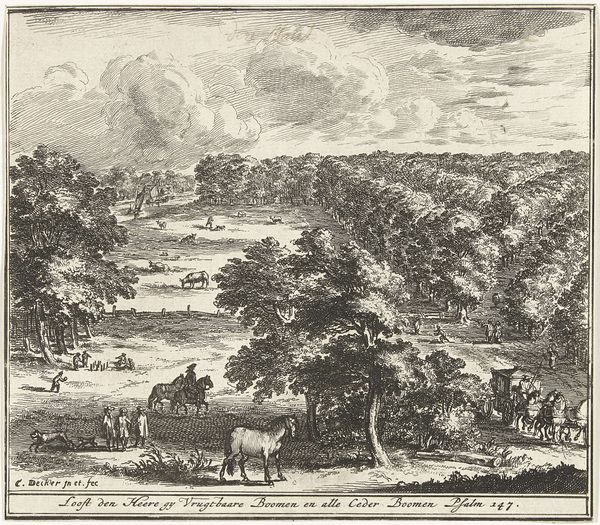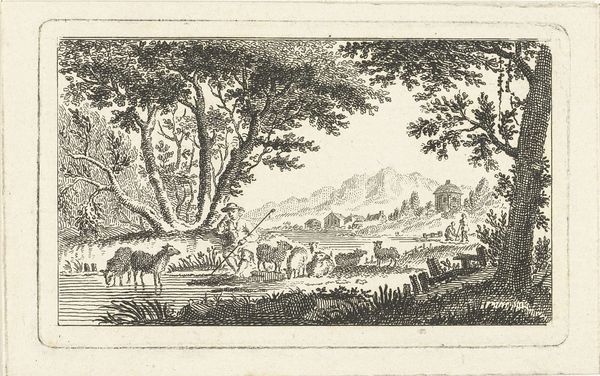 Editor: Here we have "Landscape with Herders and Cattle near Water," an etching made around 1739 by Giuliano Giampiccoli. It's quite serene, very pastoral, with figures interacting peacefully with the landscape. How do you interpret this work, looking beyond the initial impression? Curator: Beyond the initial impression, this etching invites us to consider the constructed nature of the pastoral idyll itself. How does Giampiccoli's work reflect the power dynamics embedded within representations of the countryside? Who benefits from the romanticized vision of rural life that Baroque landscapes often presented? Editor: That's interesting! I hadn't considered the power dynamics. It seemed like a simple, idealized scene. Curator: Exactly. Consider how the landscape genre itself can be implicated in narratives of ownership and control. By depicting the land in a seemingly untouched state, these images could, at times, obscure the realities of land use, resource extraction, and the laboring classes connected to these ecosystems. Who is absent from this representation and whose interests are implicitly promoted? Editor: So, by focusing on the harmony, it deflects from potential inequalities present at the time? Curator: Precisely. The focus on idyllic scenes often overshadowed the economic and social structures that underpinned that very lifestyle. These idealized representations rarely showed the labor, poverty, or social tensions that marked rural existence for many people. We must ask ourselves: what is *not* being shown here, and why? Editor: This really gives me a new lens for understanding landscapes! Thank you. Curator: And it pushes us to see art as part of a larger conversation about identity and lived realities, not just pretty pictures.
