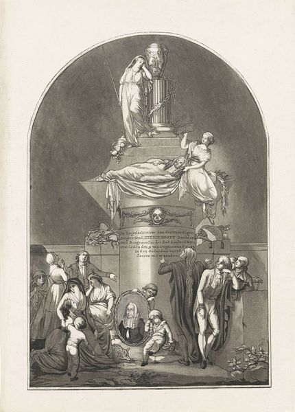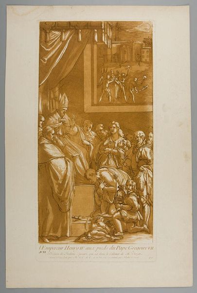 Curator: This etching by Gavriil Skorodumov, dating from 1782, is titled 'Ulysses Having by Craft Discovered Achilles, under his Disguise of a Virgin'. It presents a scene steeped in classical lore, part of the collection at the SMK. Editor: Right off the bat, there’s a strange, almost dreamlike quality to the piece, isn’t there? Everything rendered in this sepia tone gives the scene a delicate yet somewhat unsettling feel. Like a memory struggling to stay afloat. Curator: The artwork depicts a pivotal moment from the story of Achilles, specifically when Ulysses unmasks him. Thetis, his mother, had hidden him among the daughters of Lycomedes to prevent him from joining the Trojan War. It speaks to themes of fate, deception, and the societal expectations placed on heroes. Editor: I can feel the tension radiating from Achilles. He's caught between worlds, isn't he? There’s a spear in his hand yet surrounded by women. The composition subtly reveals his reluctance and innate warrior spirit clashing. The expressions all seem carefully choreographed to tease out this hidden drama. Curator: Precisely. Neoclassical art of this period often drew inspiration from ancient stories to convey moral or political messages. The image raises the question of duty versus personal choice. Is Achilles destined for greatness and the battlefield, regardless of his desires, or can he subvert this expectation? Editor: I think it plays into the eternal struggle we all have, really – wanting to forge your path against what’s expected. You feel this tug-of-war of desire and expectation even now, even when the attire has changed! And look at how vulnerable they’ve rendered Achilles; there’s beauty and power in this internal struggle. Curator: These prints were popular forms of disseminating classical stories among a wider audience. By depicting such scenes, artists offered visual interpretations of admired literature, making them more accessible to public imagination. Editor: Yes, because, as it were, sometimes seeing is believing, which creates lasting visual cultural literacy, wouldn't you say? It makes me ponder what it truly means to be seen and understood—or to hide your true nature in the theatre of public life. I'm not so sure they were so different back then! Curator: Indeed, reflecting on the image in these socio-political circumstances shows us the different, complex ways such classical pieces can address us now. Editor: Agreed; it's pretty special to be faced with this intersection of then and now within one etching!