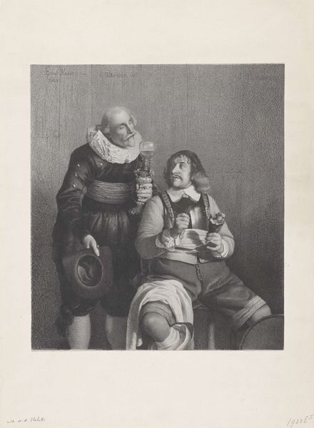 Curator: This is "Man and Woman Drinking," an engraving by John Smith, who lived from 1641 to 1690. It's currently held in the Harvard Art Museums. Editor: There's a palpable tension in the composition. The way the man's hand rests on the woman's shoulder, the shadows... it feels unsettling. Curator: It reflects a societal unease. Taverns were often spaces of social mixing, sometimes viewed with suspicion, particularly concerning gender roles and public behavior. Editor: The artist's use of light and shadow, particularly around the faces, really emphasizes the emotional weight of the scene. The woman's upward gaze is particularly striking. Curator: Indeed. Smith uses the conventions of genre scenes to explore the complex social dynamics of the time. These images served as moral commentary for the rising middle class. Editor: It is fascinating how an artist can use light, line and form to create a window into another era. Curator: Right. It's not just a picture of drinking; it's a lens through which we can view the anxieties of early modern society.